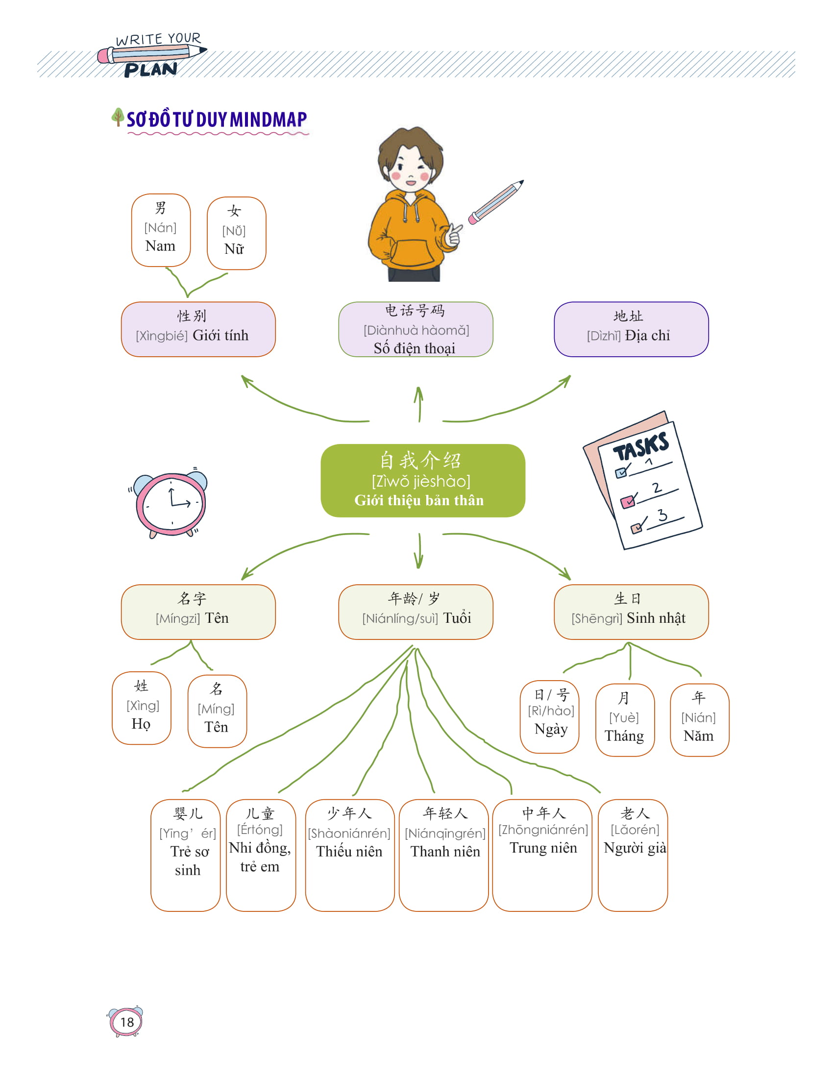 Phần này tập hợp các từ vựng với những chủ đề thông dụng kèm theo các cấu trúc câu kèm ví dụ thường dùng nhất trong giao tiếp hằng ngày như: chào hỏi, gia đình, hoạt động hằng ngày, công việc, ăn uống, giải trí,… Trình bài theo sơ đồ tư duy mindmap giúp tạo hứng thú và tăng khả năng ghi nhớ cho người học.
