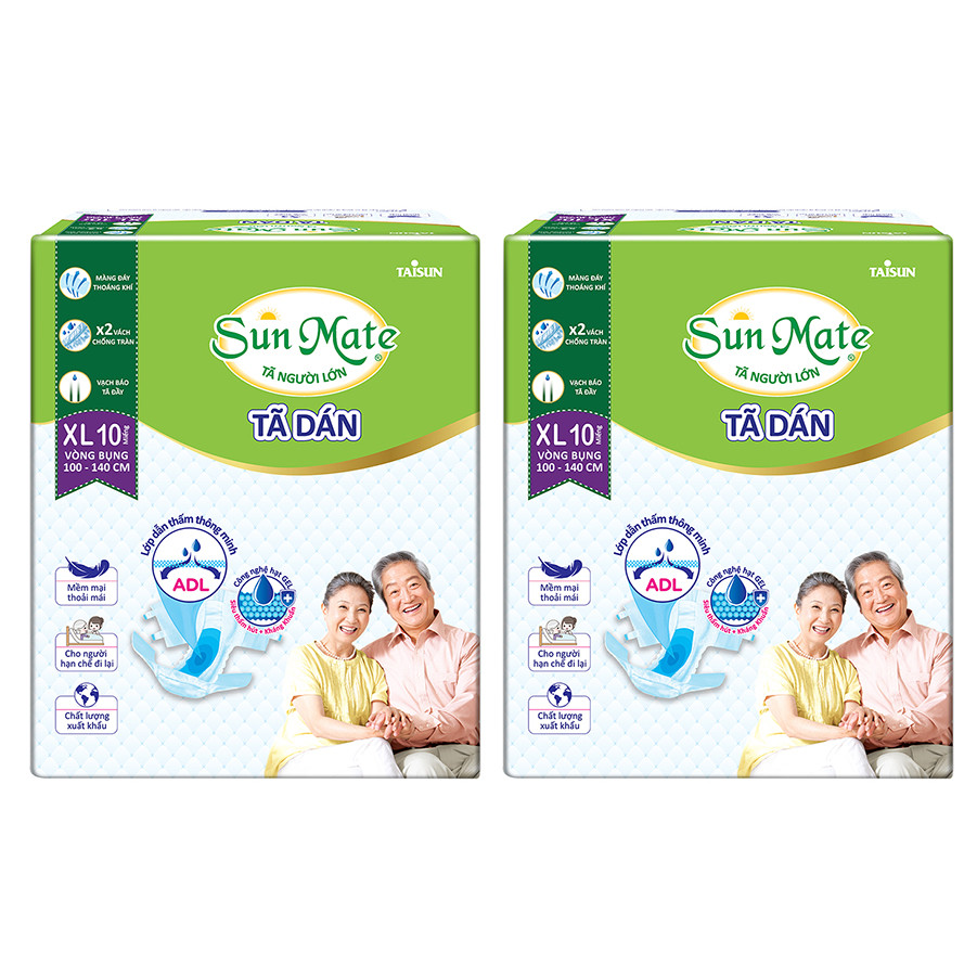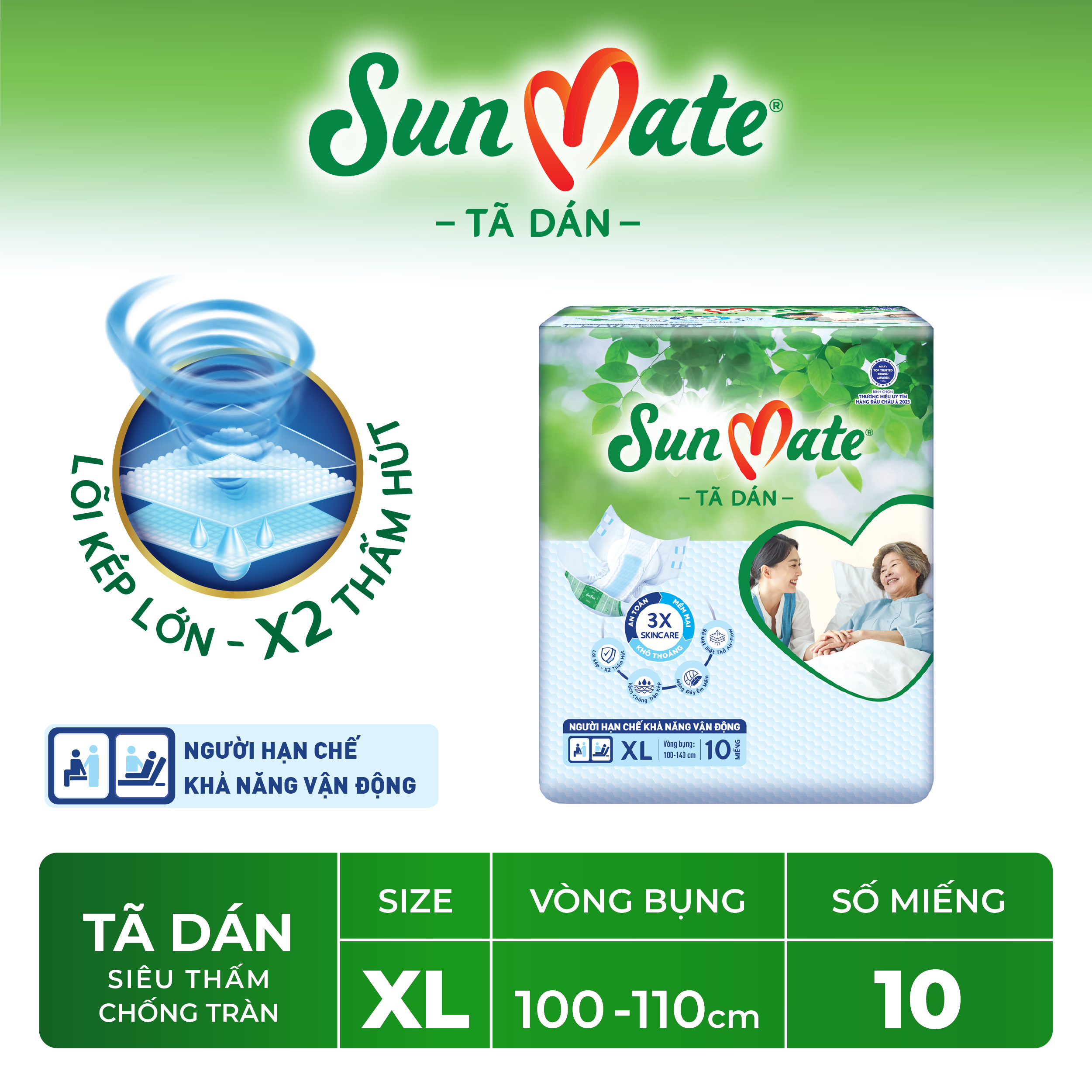 Mua tại TiktokTã Dán Người Lớn SunMate Size XL10 (10 Miếng) Tã Dán Người Lớn SunMate Size XL10 (10 Miếng) là sản phẩm đột phá sử dụng chất liệu vải không dệt kết hợp với vách chống