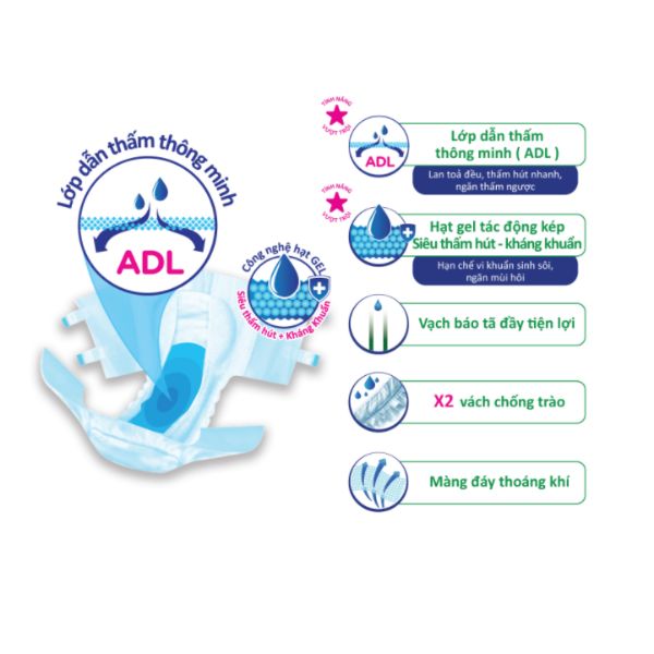 BAO BÌ SẢN PHẨM CÓ THỂ THAY ĐỔI THEO TỪNG ĐỢT NHẬP HÀNG Màng đáy thoáng khí dạng vải 100% Air-active Rãnh thấm siêu tốc giữ bề mặt tã khô thoáng Vách chống trào kép
