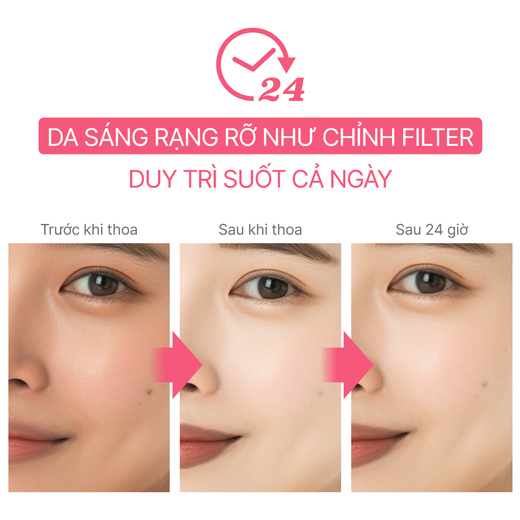 3. Sử dụng trước các sự kiện đặc biệt hoặc đi chơi hàng ngày để duy trì làn da tươi sáng và rạng rỡ suốt cả ngày dài! Được đề xuất cho