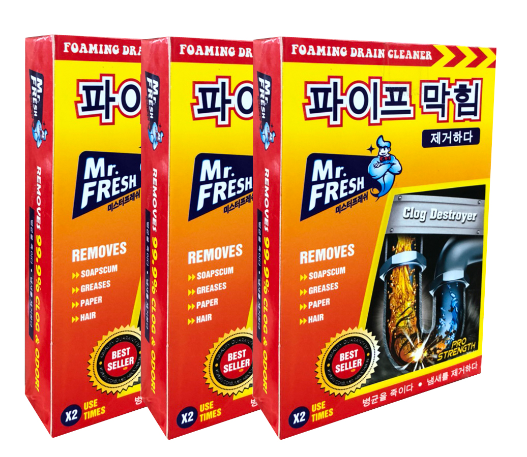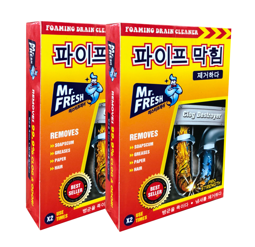 Bột thông tắc đường ống thoát nước Mr.Fresh Hàn Quốc là một trong những sản phẩm tốt nhất được bán chạy ở Hàn Quốc với công thức tiên tiến, các thành phần hóa học chuyên dụng, độ tẩy cực mạnh sẽ xoáy tan mọi cặn bẩn trong đường ống một cách hiệu quả.Sản phẩm sẽ thông sạch mọi loại cặn bẩn như giấy, rác, rau, mỡ, thịt, gạo, tóc… kẹt trong đường ống thoát nước của chậu rửa nhà bếp, lavabo, bồn tắm… mà không làm hư hại đường ống và các thiết bị vệ sinh.Bột thông tắc đường ống thoát nước Mr.Fresh Hàn Quốc trong thành phần của nó luôn có các hỗn hợp hóa học có độ kiềm, độ ăn mòn, độ phân hủy cực cao, giúp phân hủy các hợp chất hữu cơ, chất cặn bã có trong đường ống gây tắc nghẽn.
