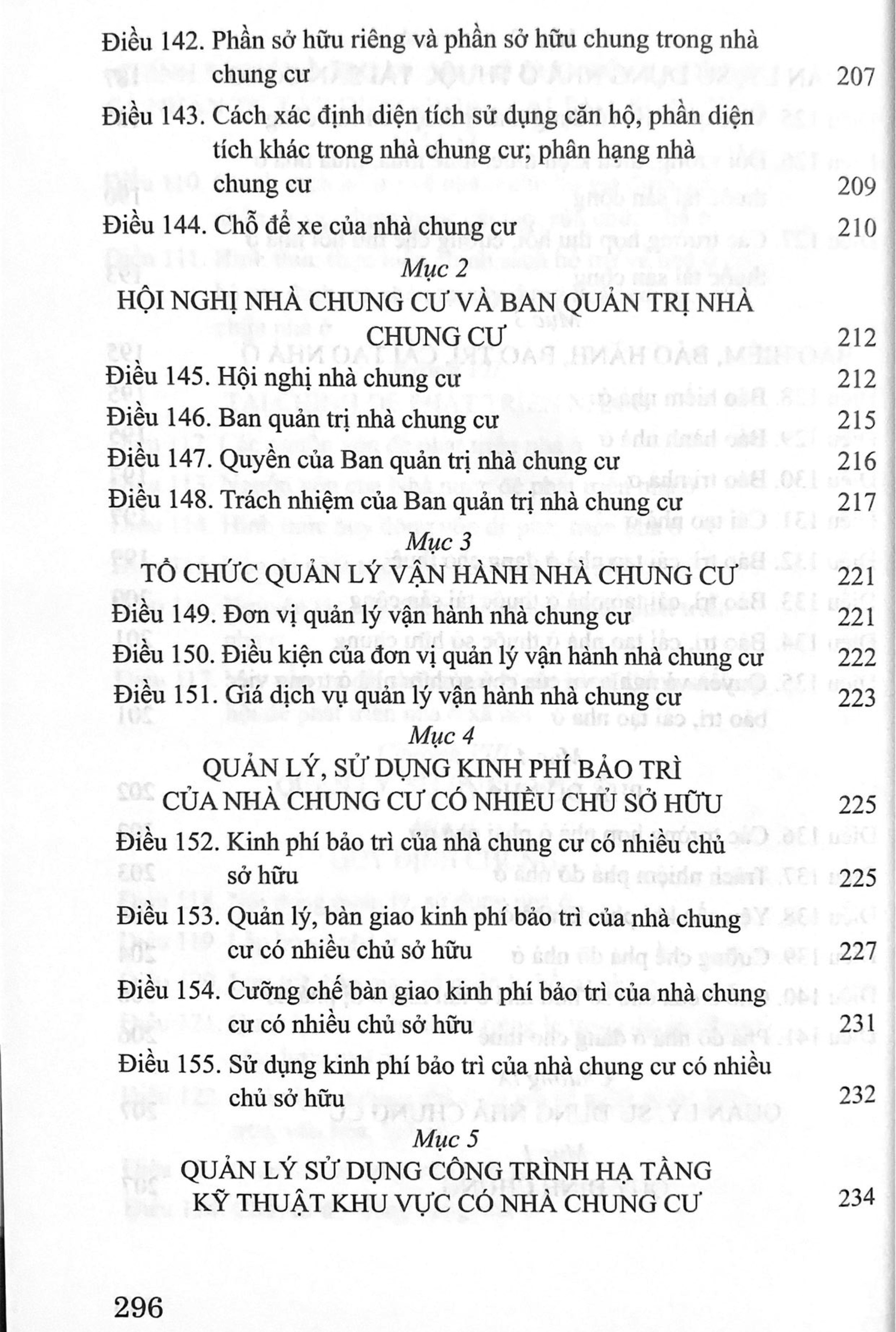 Luật Nhà ở năm 2023 được Quốc hội khóa XV thông qua tại kỳ họp thứ 6 ngày 27/11/2023 gồm 13 chương, 198 điều, điều chỉnh các vấn đề liên quan đến lĩnh vực nhà ở như: sở hữu nhà ở; chiến lược phát triển nhà ở quốc gia, chương trình, kế hoạch phát triển nhà ở cấp tỉnh; phát triển nhà ở; cải tạo, xây dựng lại nhà chung cư; chính sách về nhà ở xã hội; tài chính để phát triển nhà ở; quản lý, sử dụng nhà ở; quản lý, sử dụng nhà chung cư; giao dịch về nhà ở; quản lý nhà nước về nhà ở; giải quyết tranh chấp và xử lý vi phạm pháp luật về nhà ở.