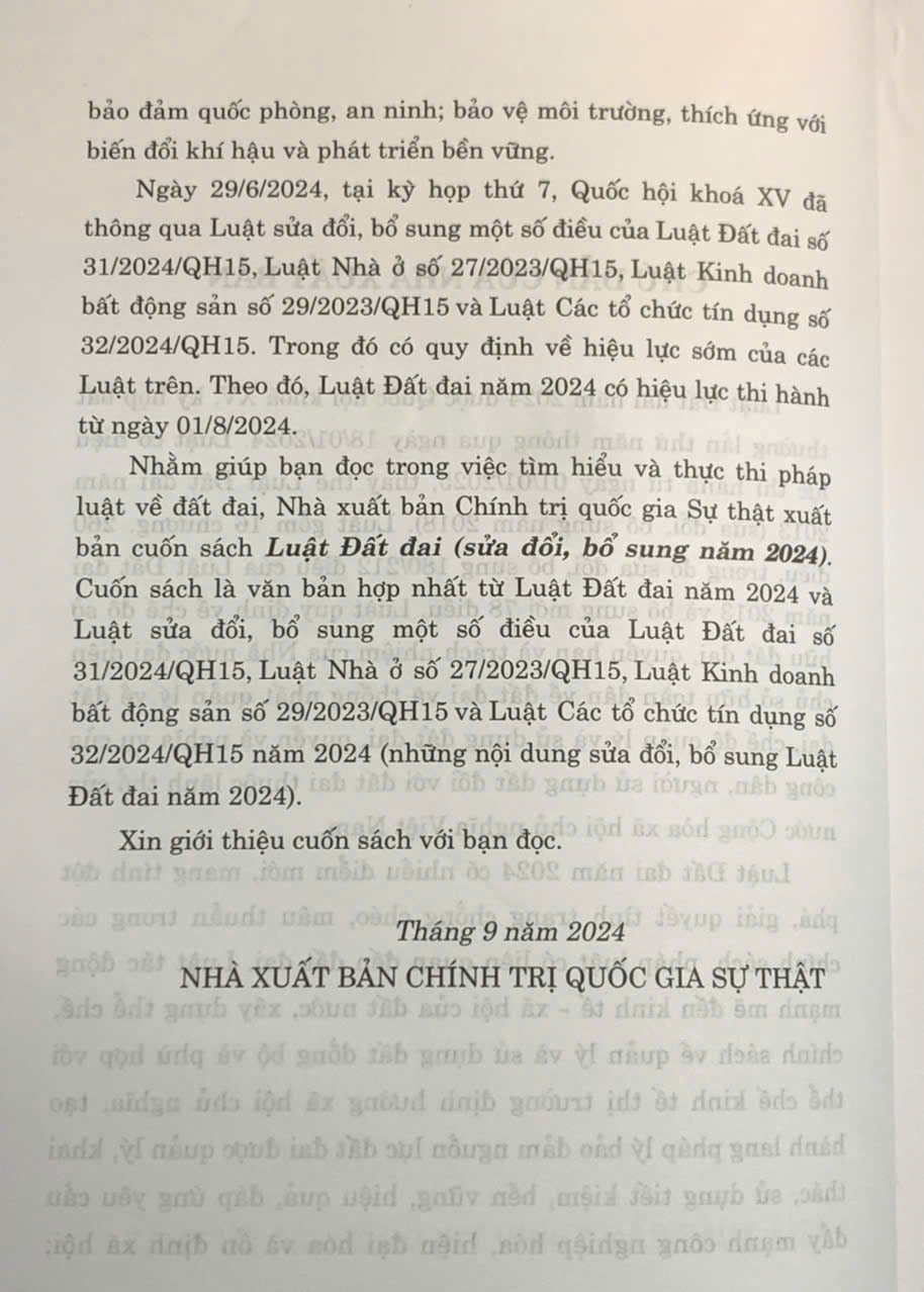 Nhằm giúp bạn đọc trong việc tìm hiểu và thực thi pháp luật về đất đai, Nhà xuất bản Chính trị quốc gia Sự thật xuất bản cuốn sách Luật Đất đai (sửa đổi, bổ sung năm 2024). Cuốn sách là văn bản hợp nhất từ Luật Đất đai năm 2024 và Luật sửa đổi, bổ sung một số điều của Luật Đất đai số 31/2024/QH15, Luật Nhà ở số 27/2023/QH15, Luật Kinh doanh bất động sản số 29/2023/QH15 và Luật Các tổ chức tín dụng số 32/2024/QH15 năm 2024 (những nội dung sửa đổi, bổ sung Luật Đất đai năm 2024).
