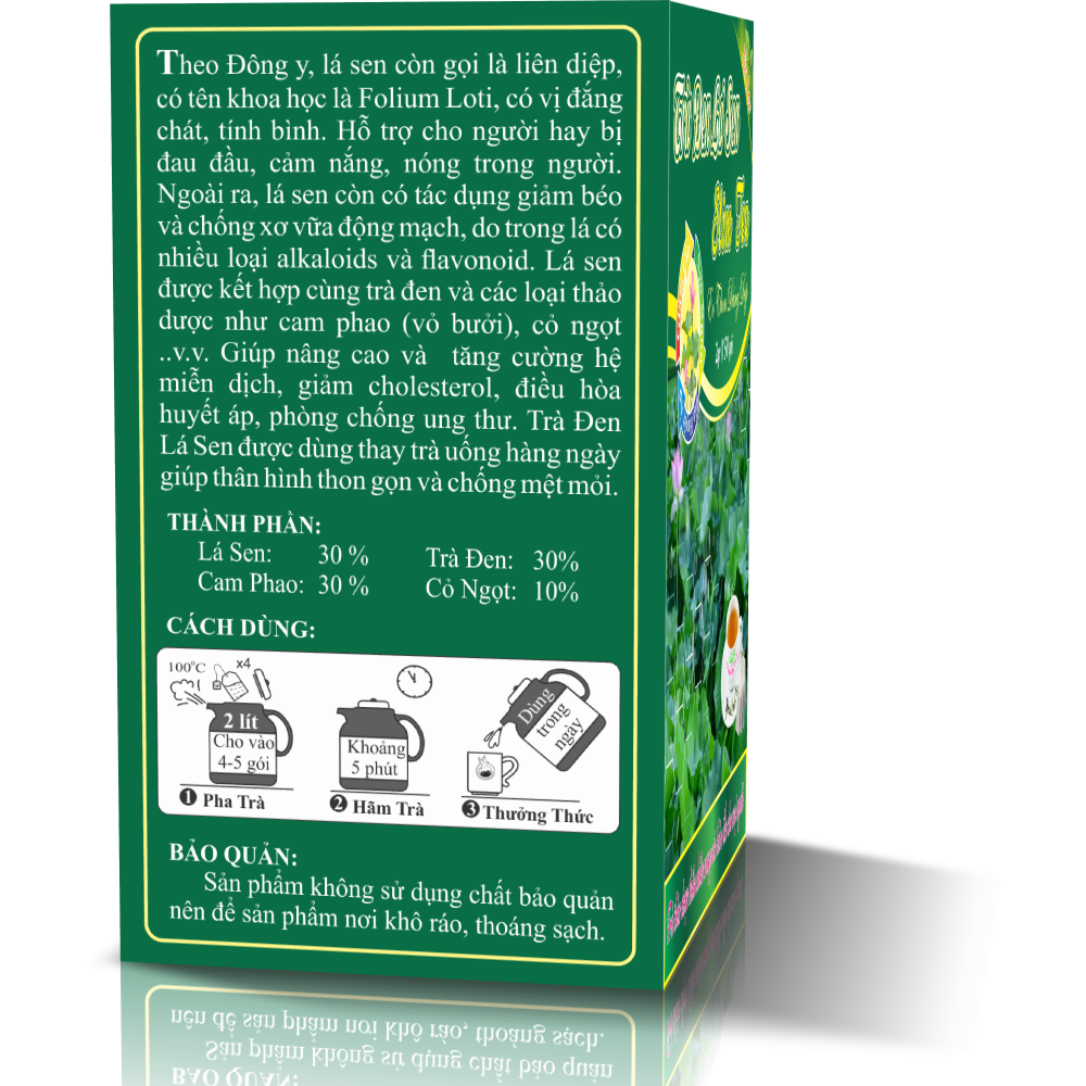 Mua tại TiktokTRÀ ĐEN LÁ SEN Theo Đông y, lá sen còn gọi là liên diệp, có tên khoa học là Folium Loti, có vị đắng chát, tính bình. Dùng để trị các chứng xuất huyết, cảm nắng, say nắng, đau bụng tiêu chảy. Ngoài ra, lá sen còn có tác dụng giảm béo và chống xơ vữa động mạch, do trong lá có nhiều loại alkaloids và flavonoid. Lá sen được kết hợp cùng trà đen và các loại thảo dược như cam phao (vỏ bưởi), cỏ ngọt Giúp nâng cao và tăng cường hệ miễn dịch, giảm cholesterol, điều hòa huyết áp, phòng chống ung thư. Trà Đen Lá Sen được dùng thay trà uống hàng ngày giúp thân hình thon gọn và chống mệt mỏi.