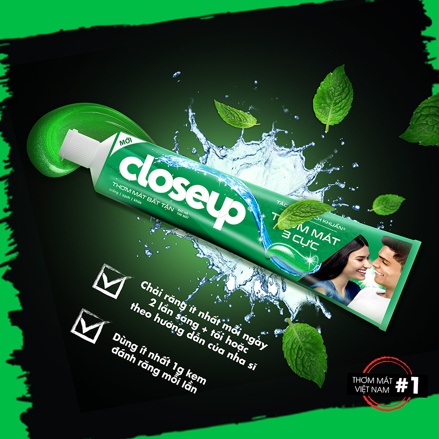 BAO BÌ THAY ĐỔI THEO TỪNG ĐỢT NHẬP HÀNG Ưu điểm nổi bật Kem đánh răng dạng gel Closeup Thơm Mát Bất Tận - Bạc Hà The Mát với Công thức Thơm Mát 3 Cực hoàn toàn mới: Công thức nước súc miệng sạch khuẩn trong kem đánh răng Closeup cho tác động đánh bay vi khuẩn, trị hôi miệng, mang lại hơi thở thơm mát. Gel trong suốt giúp làm sạch sâu khoang miệng. Lõi kem chứa các tinh thể IceCool mang lại hơi thở thơm mát dài lâu. Hiệu quả sử dụng Hơi thở thơm mát Răng miệng sạch sâu Khoang miệng sạch khuẩn Hướng dẫn sử dụng Chải răng ít nhất mỗi ngày 2 lần sáng + tối hoặc theo hướng dẫn của nha sĩ Dùng ít nhất 1g kem đánh răng mỗi lần Trẻ em dưới 6 tuổi chỉ sử dụng một lượng kem đánh răng nhỏ bằng hạt đậu Tiết kiệm nước bằng cách đóng vòi nước trong khi chải răng