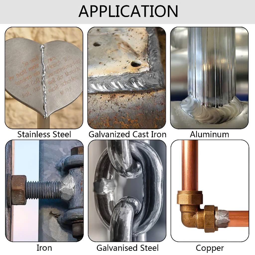 Ứng Dụng Của Combo 30 Que Hàn Đa Năng  Sửa chữa đồ gia dụng: Hàn nhôm, inox, đồng trong gia đình như nồi, chảo, ấm đun nước, đường ống kim loại.  Gia công cơ khí: Hàn bản lề, khung nhôm, khung sắt, tay vịn cầu thang, kết cấu kim loại nhẹ.  Chế tạo và DIY: Dùng để tạo ra các sản phẩm thủ công bằng kim loại, sửa chữa xe đạp, xe máy.  Ngành điện lạnh: Hàn ống đồng trong máy lạnh, tủ lạnh mà không cần hàn hồ quang.