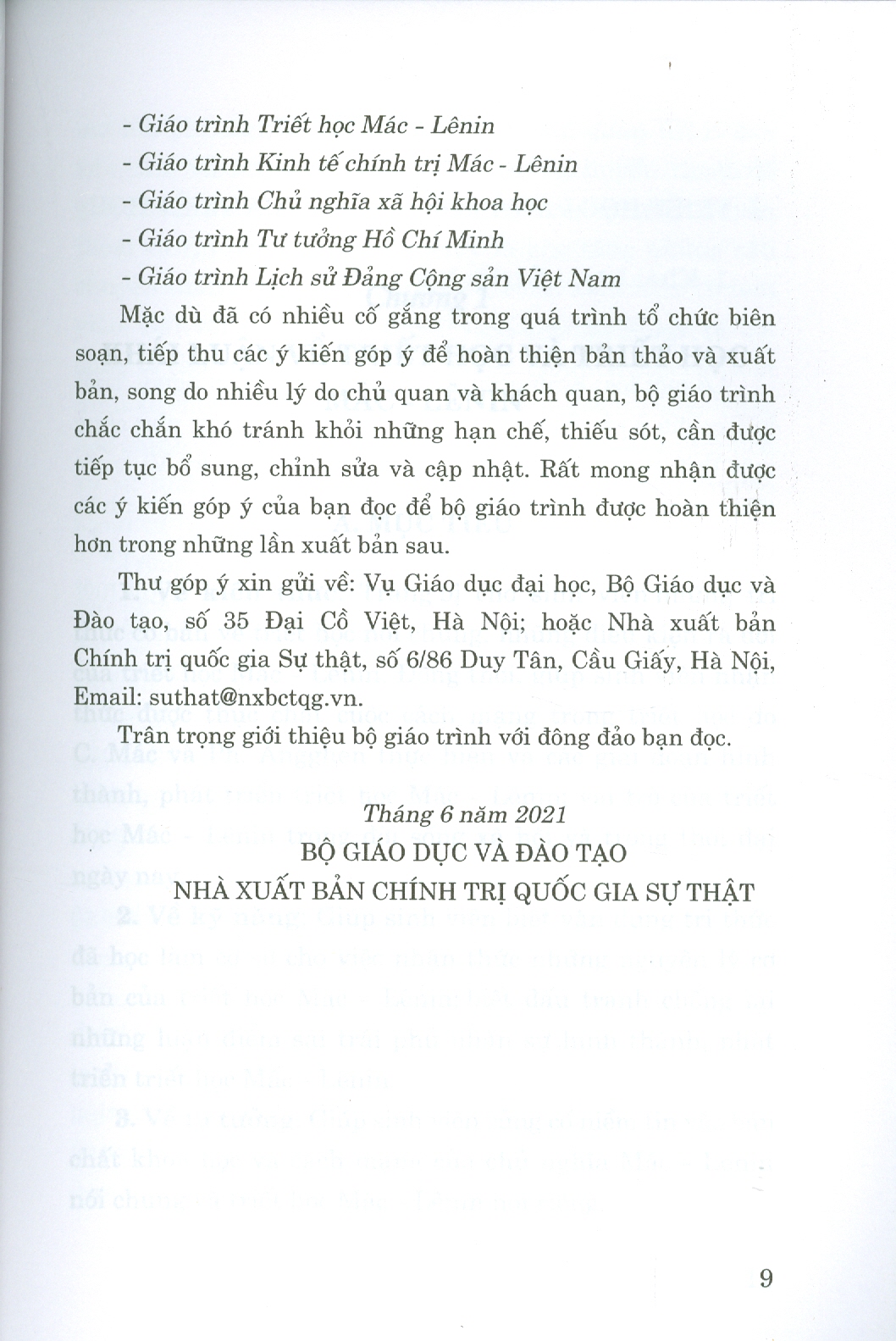 Bộ giáo trình được biên soạn theo tinh thần đổi mới cả về nội dung và phương pháp giảng dạy, tiếp cận với những phương pháp giáo dục mới, cập nhật những nghiên cứu, kiến thức lý luận chính trị mới, chú trọng liên hệ với thực tiễn công cuộc đổi mới, phát triển đất nước.