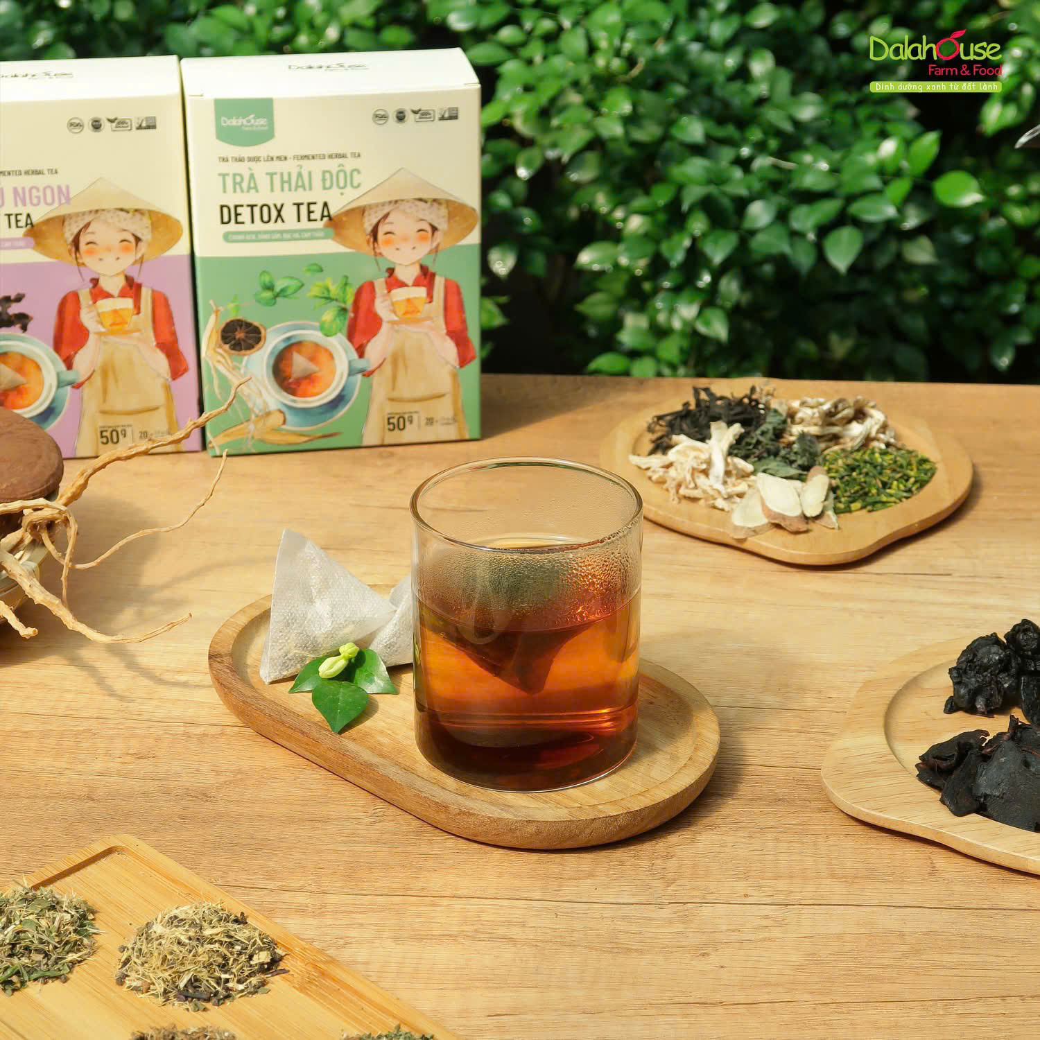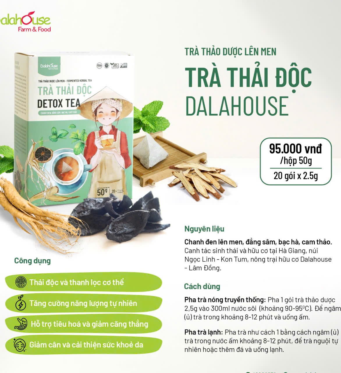 - Trà thải độc: 100% nguyên liệu canh tác sinh thái và hữu cơ. Chanh đen (chanh lên men), đẳng sâm, cam thảo, bạc hà.