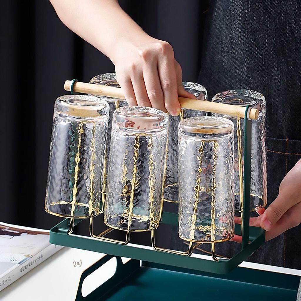 Chất liệu: thủy tinh Bộ sản phẩm gồm: 6 cốc thủy viền vàng VÀ GIÁ ÚP CỐC THEO HÌNH Thiết kế đẹp mắt, phù hợp tiện dụng Độ bền cao, chịu nhiệt tốt, hạn chế