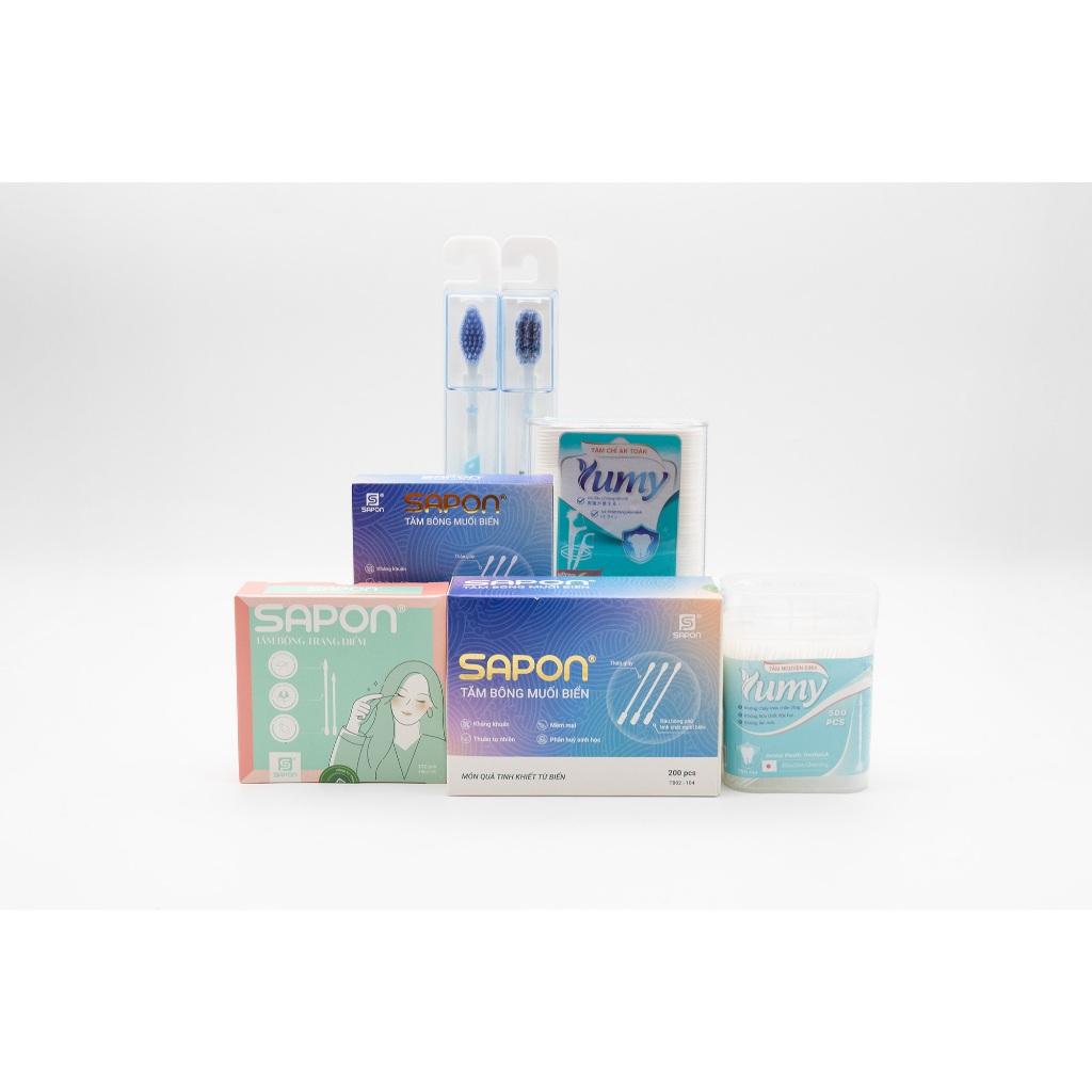Combo cá nhân chăm sóc răng miệng – Tăm bông, tăm chỉ, tăm nhựa, bàn chải, hộp mini | SAPON 6 món tiện lợi [TB02-104 + TC02-130 + TC02-126 + TN11-133 + BC01-108 + TN11-124]