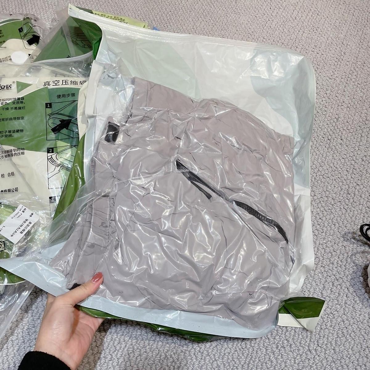 - 2 túi trung (80cm*60cm)cm đựng 5 áo khoác hoặc chăn mỏng Chất liệu nhựa PA+PE cao cấp, dày dặn với độ bền cao, dễ dàng vệ sinh, làm sạch, có thể tái sử dụng nhiều lần, tiết kiệm được nhiều chi phí và hoàn toàn thân thiện với môi trường. Combo 6 Túi Hút Chân Không Đựng Chăn Màn, Quần Áo Kèm Bơm Điện Đa Năng, Chống Ẩm Mốc Bụi, Bảo Quản Quần Áo Chăn Gối Mền -Bước 1: Gấp gọn đồ cần cho vào túi, mở miệng túi rồi sắp xếp đồ vào trong túi thật ngăn nắp (Bước này rất quan trọng vì nó sẽ giúp bạn chứa được nhiều đồ vào trong túi)