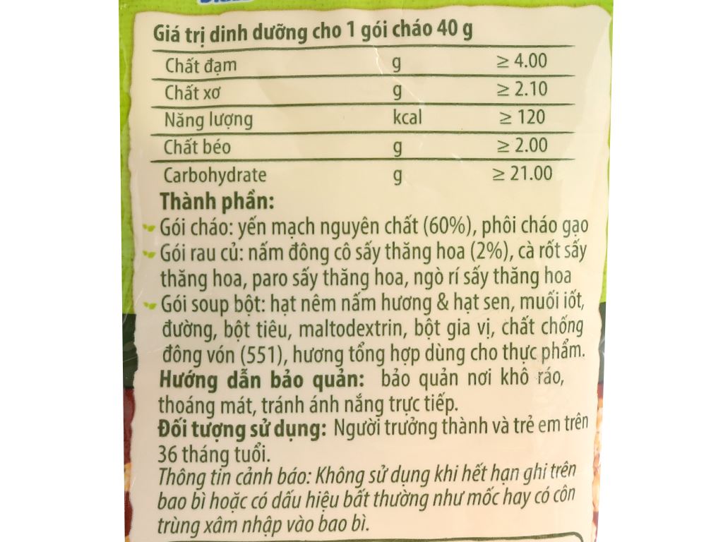 Thành phần: Gói cháo yến mạch nguyên chất (60%), phôi cháo gạo. Gói rau củ:Nấm Đông Cô; cà rốt, paro, ngò rí sấy thăng hoa. Gói soup bột: hạt nêm nấm hương và hạt sen,