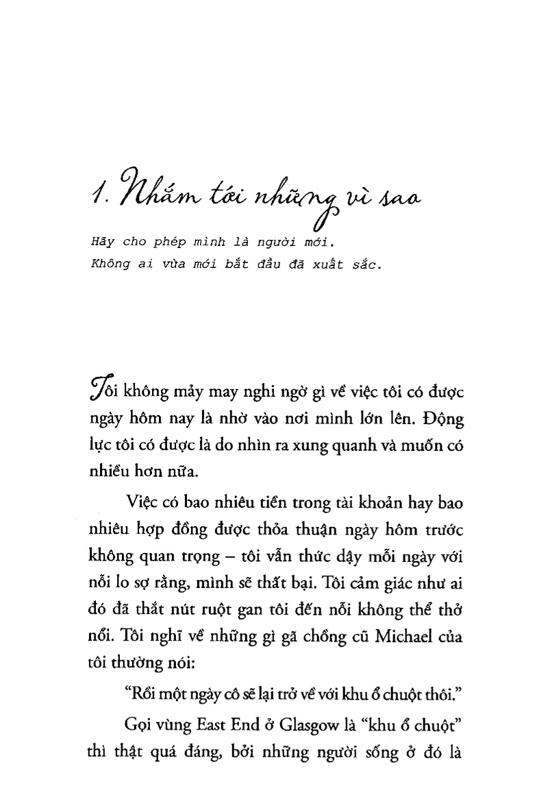 Thời thơ ấu của tôi chủ yếu chìm trong bi kịch và khó khăn. Tôi từng ngủ trong chiếc tủ đặt trong phòng ngủ của bố mẹ ở vùng East End nghèo khó thuộc thành phố Glasgow, từng bị một nhóm cả chục tên đánh đập đến mức phải nhập viện và thường khóc đến mệt nhoài rồi ngủ thiếp đi mỗi đêm sau khi cha tôi bị liệt nửa phần thân dưới. Tôi trở hành một người mẹ trẻ ở tuổi 20 và suýt nữa mất đứa con thứ hai khi thằng bé bị sinh non bốn tuần. Áp lực của việc vừa kinh doanh vừa cố làm một người mẹ tốt đã đẩy tôi đến bên bờ vực thẳm. Vào thời điểm tồi tệ nhất, tôi tăng cân đến mức phải mặc quần áo cỡ XL và từng nghĩ đến việc tự tử. Tôi đã xoay chuyển tình thế từ việc đứng bên bờ phá sản sang việc có hàng triệu đô - la trong ngân hàng. Tôi đắm chìm trong lối sống thượng lưu khi lái những chiếc xe bóng bẩy đắt tiền và đi ăn tiệm với những nhân vật nổi tiếng thế giới, như gia đình Clinton chẳng hạn. Tôi suýt nữa chết chìm trong thời khắc khó khăn nhất khi cuộc hôn nhân của tôi chính thức đổ vỡ trước công chúng. Tên tôi bị lôi lên khắp các mặt báo khi người ta phát hiện ra chồng tôi ngoại tình với trưởng nhóm thiết kế của tôi. Và sau đó tôi phải đấu tranh để giành lại doanh nghiệp mà tôi đã gây dựng từ hai bàn tay trắng” Đó chính là lời bộc bạch của bà trùm nội y Michelle Mone về cuộc đời mình. Mỗi ngày đều là một bước tiến , một nỗ lực không ngừng nghỉ, một sự hăng hái nhiệt huyết mạnh mẽ mà Michelle dành cho công việc và cuộc sống.