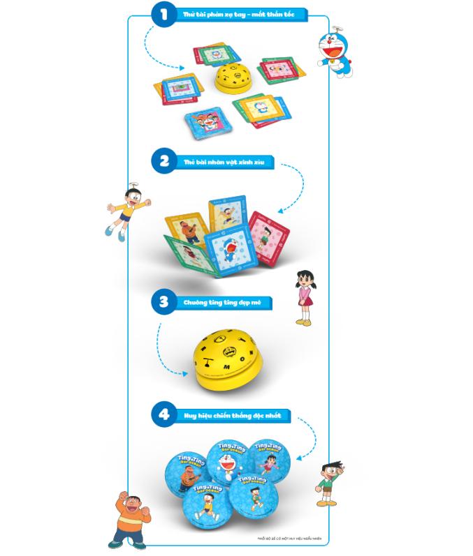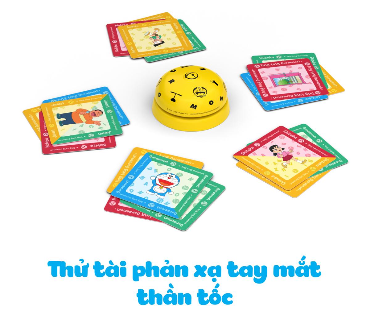- Boardgame Ting Ting Doraemon - Bộ Trò Chơi Đầu Tiên Của Doraemon Tại Việt Nam Doraemon - chú mèo máy màu xanh nổi tiếng trên toàn thế giới trong loạt Mangacùng tên của họa sĩ Fujiko F. Fujio, chính thức trở thành đại sứ hoạt hình của Nhật Bản vào năm 2008. Ở Việt Nam, Doraemon, Nobita cùng những người bạn của m.ình luôn nhận được sự yêu mến nồng nhiệt từ các bạn thiếu nhi cho đến các bậc phụ huynh vì những câu chuyện tích cực, vui nhộn, gắn liền với tuổi thơ của bao thế hệ con người Việt Nam đến này. Hòa trong không khí vui tươi nhân dịp kỷ niệm 90 năm ngày sinh của tác giả Fujiko F Fujio (1933 - 2023) và 50 năm quan hệ ngoại giao Nhân Bản, Board Game Việt Nam chính thức phát hành board game đầu tiên của Doraemon tại Việt Nam - một món quà đặt biệt đến từ người bạn tuổi thơ Doraemon mà bất kỳ Fan Doraemon nào cũng không thể bỏ lỡ. Trò Chơi Nhanh Tay - Tinh Mắt Vui Nhộn Cho Cả Gia Đình Trò chơi giúp rèn luyện phản xạ tay mắt với luật chơi siêu đơn giản nhưng cực vui nhộn, không chỉ dành cho các bạn nhỏ, mà ba mẹ hay ông bà đều có thể chơi. Ai là người tinh mắt phát hiện ra thẻ bài Nhật Vật cùng màu với thẻ bài Cánh cửa thần kỳ thì nhanh tay đập chuông ring hết thẻ bài và chiến thắng! Sở Hữu Thành Phần Độc Nhất Với Những Hình Ảnh Được Cung Cấp Bởi Chính Chủ Bản Quyền Của Doraemon Trò chơi được thiết kế xinh xỉu với những hình ảnh vui tươi cùng các thành phần trò chơi độc đáo không thể thiếu trong bộ sưu tầm của các Fan Doraemon. Điểm đặc biệt nhất của bộ trò chơi là thiết kế độc đáo của Chuông Ting Ting, chỉ xuất hiện duy nhất trong bộ trò chơi Ting Ting Doraemon, chắc chắn sẽ khiến bạn mê mẩn.