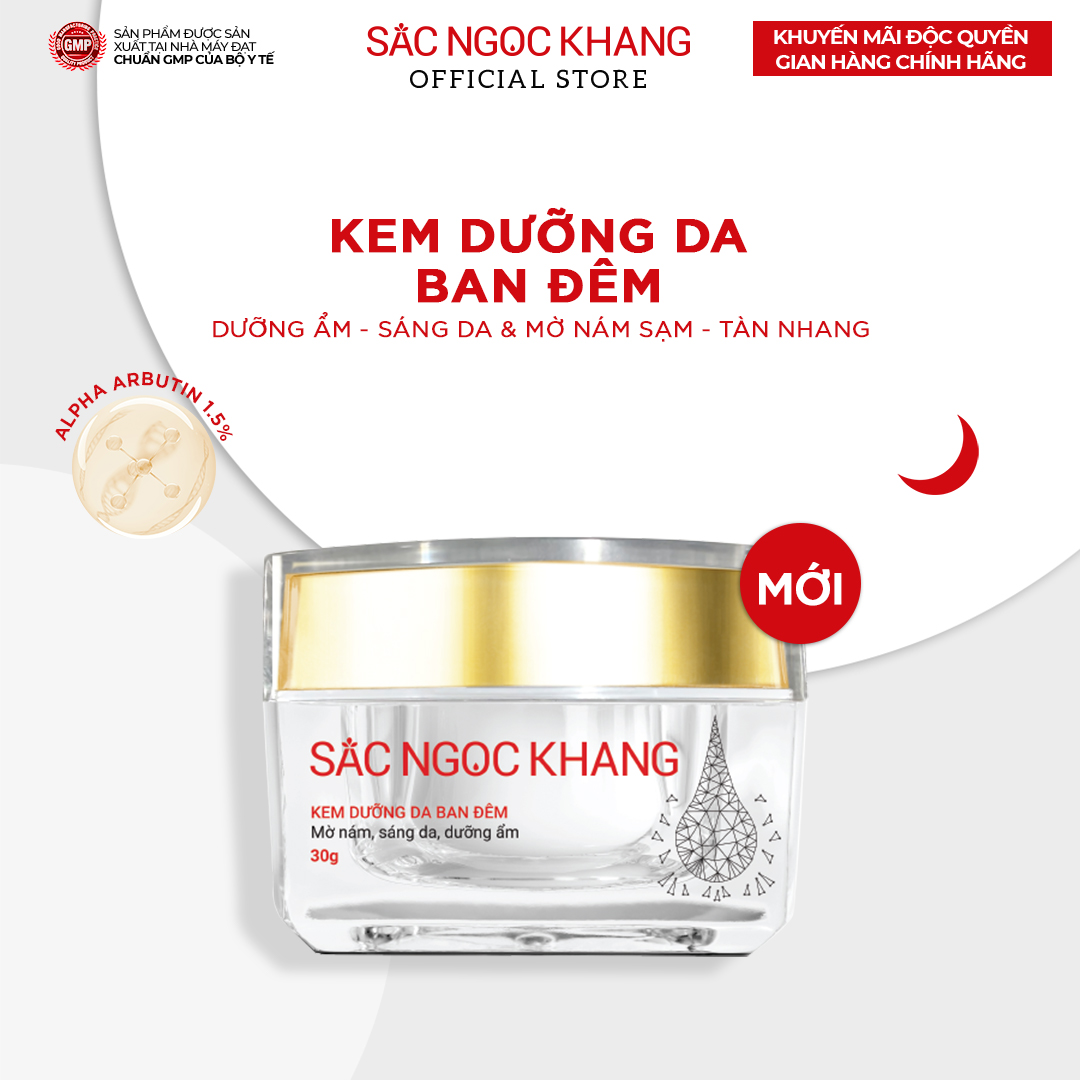 - Kem dưỡng da ban đêm Sắc Ngọc Khang Hộp 30g Kem dưỡng Sắc Ngọc Khang 5 trong 1 ban ngày 30ml giúp nuôi dưỡng làn da sáng khỏe, mờ thâm nám ngăn ngừa lão hóa Dưỡng sáng vượt trội – nâng tông tự nhiên – chống nắng – dưỡng ẩm căng mịn – ngăn ngừa lão hóa 1.Thành phần chính: