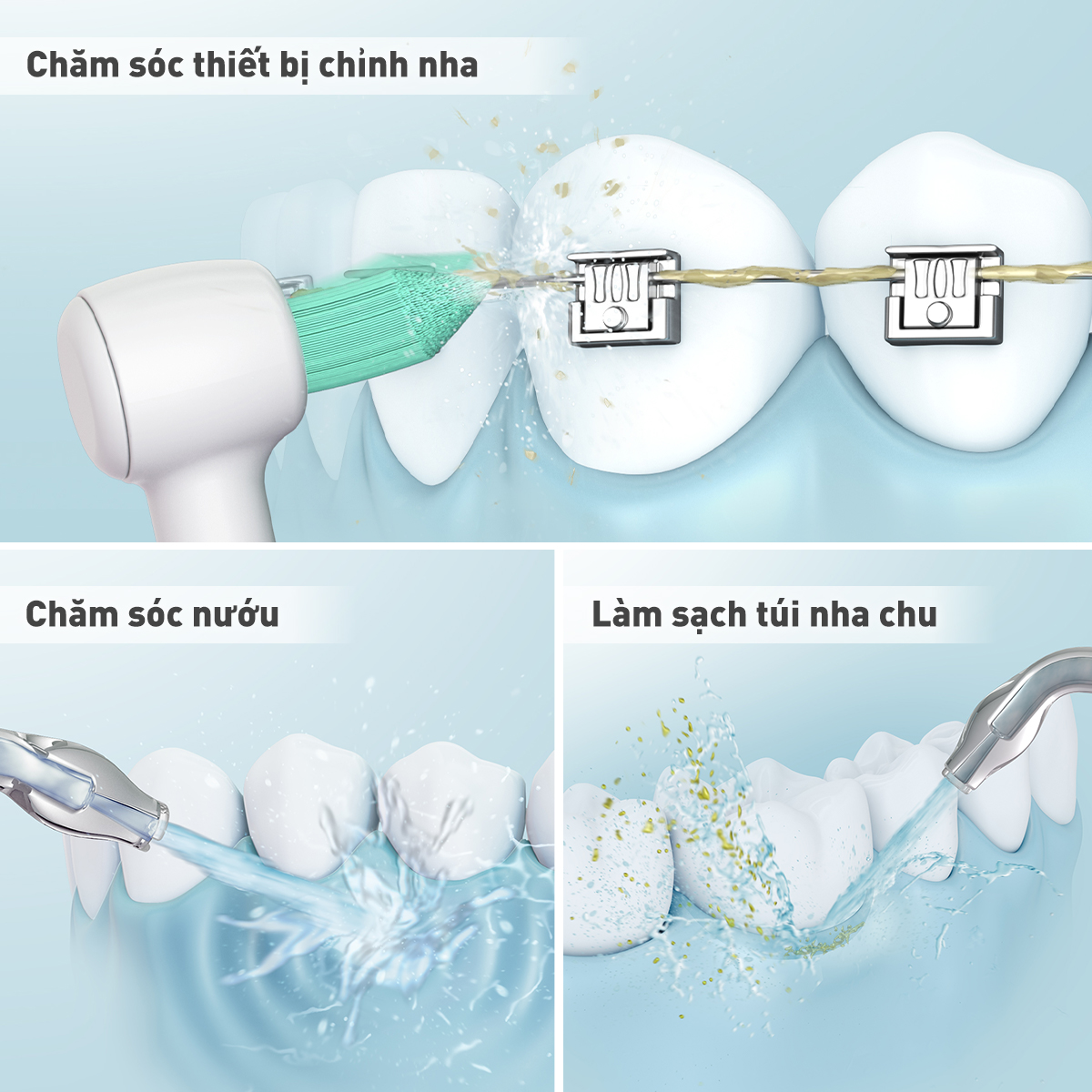 - Đầu dẫn nước bằng cao su mềm tác động nhẹ nhàng trên nướu. - Dễ dàng tháo lắp trên tay cầm - Làm sạch răng kỹ lưỡng. - Làm trôi mảng bám trên tối