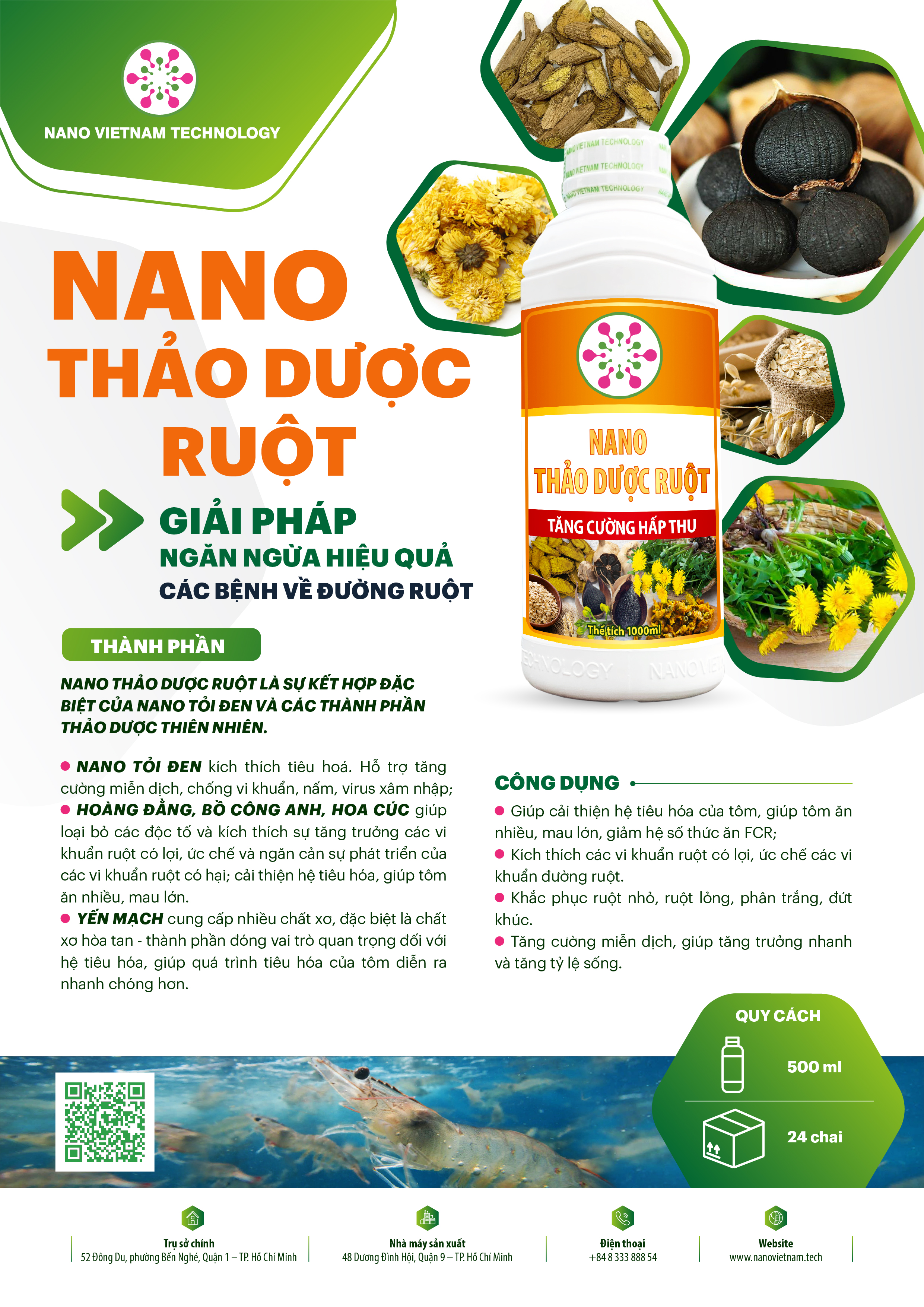 - Kiểm soát tốt khuẩn, nấm, ký sinh trùng trong ruột tôm cá. Nano Thảo Dược Ruột là sự kết hợp đặc biệt của nano tỏi đen và các thành phần thảo dược thiên nhiên giúp tăng sức đề kháng đường ruột, hấp thụ và chuyển hóa chất dinh dưỡng. Khắc phục hiện tưởng lỏng ruột, trống ruột, tăng khả năng hấp thu thức ăn. CÔNG DỤNG: