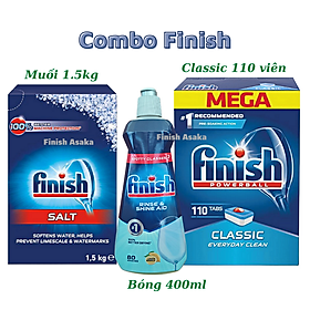 ✨Combo rửa bát Finish: Hộp Classic 110 viên, Nước làm bóng chai 400ml, Muối hộp 1,5kg - Chính hãng.