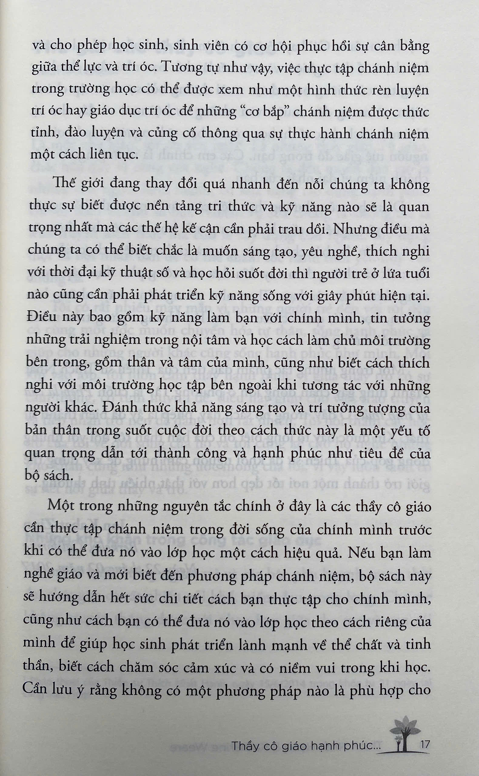 “Thầy cô giáo hạnh phúc sẽ thay đổi thế giới” - bộ sách bạn đang cầm trên tay là một món quà đặc biệt quan trọng - hay nói cách khác là một sự trao truyền - từ Thiền sư Thích Nhất Hạnh trao tặng vào giai đoạn chín muồi của một nhân cách vĩ đại. Bạn sẽ thấy rằng nó là kết tinh tình thương sâu sắc của Thiền sư đối với những người trẻ và sự mong mỏi không ngừng về một nền giáo dục bồi dưỡng tài và đức cho các thế hệ mai sau. Ở mỗi trang, bạn có thể cảm được sự tôn vinh dành cho những con người đang thực hiện sứ mệnh này, thường là âm thầm không ai biết, và khối lượng công việc khổng lồ mà họ gánh vác từng ngày nhằm phục vụ cho công cuộc kiến tạo, chuyển hóa và hàn gắn thế giới của chúng ta từ dưới lên, từ thế hệ này sang thế hệ khác - đó là những người thầy, người cô. Đây cũng đồng thời là tác phẩm được kết tinh từ sự cộng tác đầy cảm hứng với giáo sư Katherine Weare, một nhà giáo dục và cũng là một giáo viên về chánh niệm, người đã có nhiều năm nghiên cứu những tác động của thực tập chánh niệm trong môi trường học đường, và đội ngũ các cây bút cố vấn, những học trò lớn của Thiền sư từ Làng Mai. Cùng nhau họ đã thiết kế một cẩm nang thiền tập mang tính đa diện và rất dễ sử dụng để giúp các thầy cô giáo có thể đem chánh niệm vào lớp học cũng như vào đời sống của chính mình bằng nhiều hình thức. Bộ sách gồm 2 cuốn: Tập 1 “Cẩm nang hạnh phúc”, tập 2 “Đi như một dòng sông” Trong cuốn “Cẩm nang hạnh phúc” thầy Thích Nhất Hạnh và tác giả Katherine Weare sẽ chia sẻ chi tiết về chánh niệm và tỉnh thức. Bởi thế giới đang thay đổi quá nhanh đến nỗi chúng ta không thực sự biết được nền tảng tri thức và kỹ năng nào sẽ là quan trọng nhất mà các thế hệ kế cận cần phải trau dồi. Nhưng điều mà chúng ta có thể biết chắc là muốn sáng tạo, yêu nghề, thích nghi với thời đại kỹ thuật số và học hỏi suốt đời thì người trẻ ở lứa tuổi nào cũng cần phải phát triển kỹ năng sống với giây phút hiện tại. Điều này bao gồm kỹ năng làm bạn với chính mình, tin tưởng những trải nghiệm trong nội tâm và học cách làm chủ môi trường bên trong, gồm thân và tâm của mình, cũng như biết cách thích nghi với môi trường học tập bên ngoài khi tương tác với những người khác. Đánh thức khả năng sáng tạo và trí tưởng tượng của bản thân trong suốt cuộc đời theo cách thức này là một yếu tố quan trọng dẫn tới thành công và hạnh phúc như tiêu đề của  bộ sách. Một trong những nguyên tắc chính ở đây là các thầy cô giáo cần thực tập chánh niệm trong đời sống của chính mình trước khi có thể đưa nó vào lớp học một cách hiệu quả. Nếu bạn làm nghề giáo và mới biết đến phương pháp chánh niệm, bộ sách này sẽ hướng dẫn hết sức chi tiết cách bạn thực tập cho chính mình, cũng như cách bạn có thể đưa nó vào lớp học theo cách riêng của mình để giúp học sinh phát triển lành mạnh về thể chất và tinh thần, biết cách chăm sóc cảm xúc và có niềm vui trong khi học. Cần lưu ý rằng không có một phương pháp nào là phù hợp cho mọi hoàn cảnh. Cái hay của cách nhìn này là cho bạn một loạt các lựa chọn để thử nghiệm và trên hết là nhắc bạn nhớ rằng chính sự sáng tạo của riêng bạn, được nuôi dưỡng bởi sự thực tập chánh niệm, sẽ mang đến muôn vàn những cơ hội mới và đầy thú vị. Nói một cách thực tế thì học trò của bạn sẽ là người giúp khơi mở nguồn tuệ giác đó trong bạn. Các em chính là những người thầy chánh niệm vĩ đại nhất của bạn. Điểm hay của phương thức tiếp cận này là nó có thể bắt nguồn từ tình yêu nghề và tấm lòng mong mỏi học trò tiến bộ, được ấp ủ và truyền đạt bởi chính trực giác và kinh nghiệm thực tiễn của bạn; tất cả những điều này đều dựa vào công phu thực tập trong từng thời khắc của bạn. Theo như tôi nghiệm thấy, những băn khoăn, học hỏi, quán chiếu cứ lớn lên không ngừng trên mảnh đất nuôi dưỡng ấy.