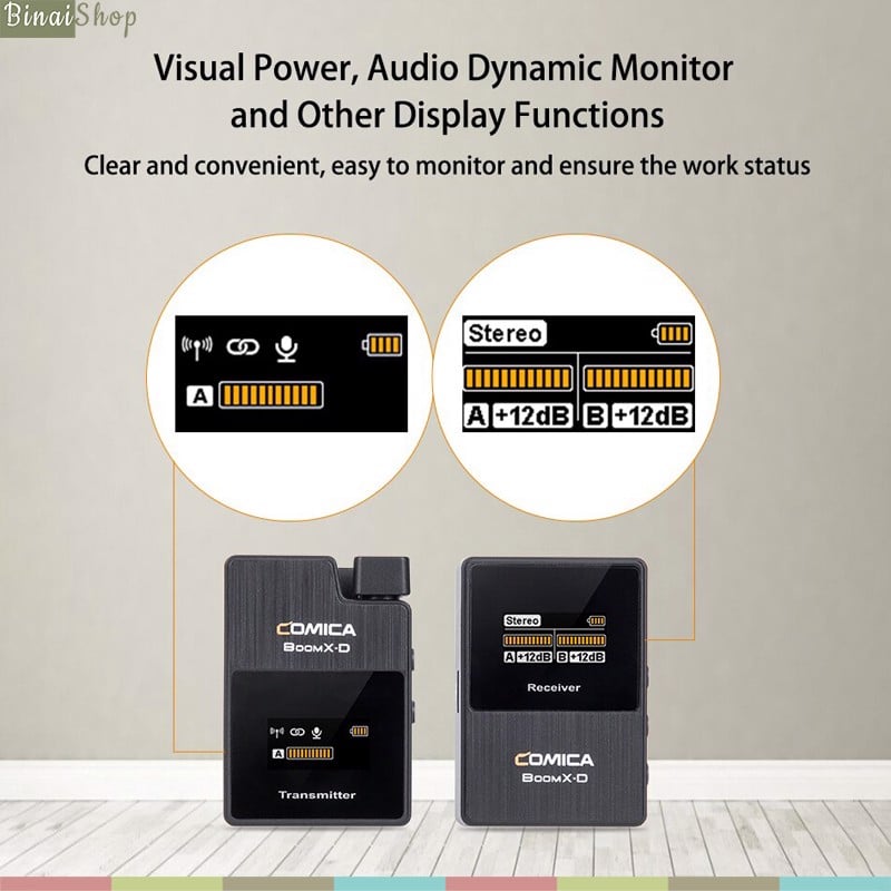 - Màn hình trên transmitter hiển thị cường độ tín hiệu, mức âm thanh, cấu hình mono/stereo và thời lượng pin giúp bạn dễ dàng theo dõi thông số thiết bị của mình.
