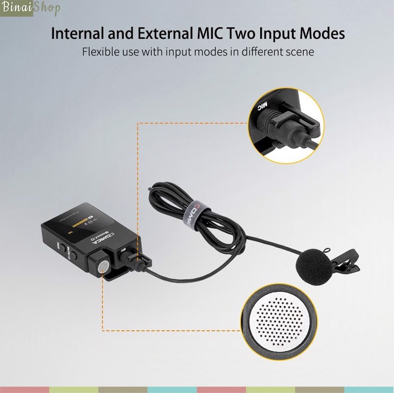 - Có thể sử dụng micro tích hợp sẵn trên transmiter giống như micro phỏng vấn cầm tay hoặc micro lavalier cài áo nhỏ gọn cung cấp nhiều phương thức sử dụng hơn.