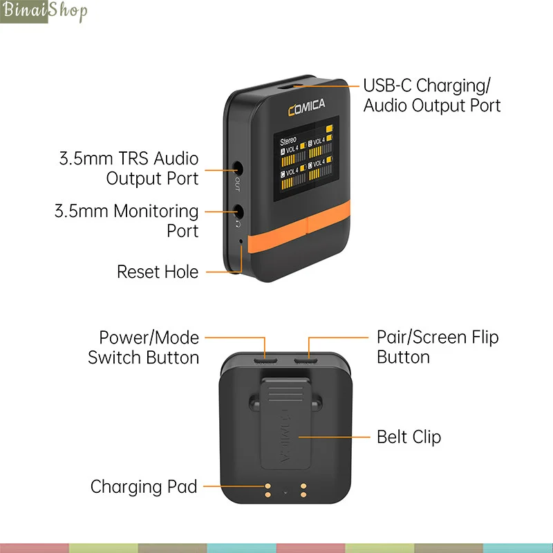 - Micro cài áo không dây Comica Vimo Q được thiết kế với 4 kênh sử dụng cho từ 4 người, với đầu ra kỹ thuật số USB-C và đầu ra Analog 3.5mm giúp tương thích