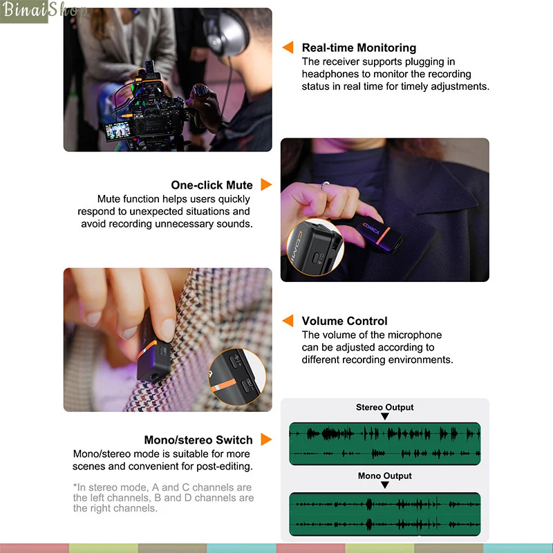 Cổng tai nghe trên Receiver giúp kiểm soát chất lượng và bản thu để có điều chỉnh kịp thời. Chức năng tắt tiếng trên Transmitter (micro) hỗ trợ phản ứng nhanh với những tình huống bất ngờ và thu âm thanh không cần thiết.