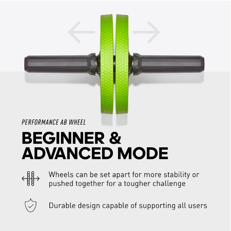 Thiết kế bánh xe kép của Performance Ab Wheel có cả chế độ dành cho người mới bắt đầu và nâng cao, đối với người mới tập thì bánh xe có thể mở rộng ra 2 bên giúp bạn ổn định hơn, đối với gymer chuyên nghiệp thì bánh xe có thể kéo sát vào bên trong để bạn tập trung sức mạnh vào cơ tay để giữ cân bằng, mang đến hiệu quả tập luyện tốt hơn.
