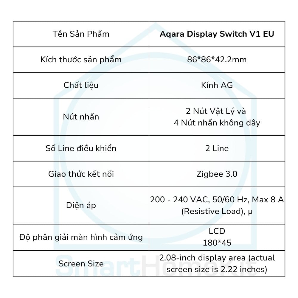 - Giao thức kết nối Zigbee (Cần có , , , …) Công tắc kết hợp màn hình mới lạ Công tắc thông minh Aqara V1 Display Switch được thiết kế tinh xảo, trung tâm công tắc tích hợp màn hình LCD, giúp hiển thị các tính năng và các tùy chỉnh chức năng với tất cả các thiết bị Aqara. Với mẫu mã đa dạng giúp bạn có thể lựa chọn phong cách phù hợp cho không gian của ngôi nhà. Aqara V1 được thiết kế với mặt kính AG cao cấp, mang đến cảm giác chạm mượt mà và tinh tế. Vật liệu PC được xử lý đặc biệt, tạo nên bề mặt chống vân tay và cảm giác mịn màng. Công tắc vi động đảm bảo thao tác chính xác và nhẹ nhàng. Sự kết hợp hài hòa giữa công nghệ và thiết kế tạo nên sản phẩm độc đáo và sang trọng. *Chức năng màn hình này sẽ chỉ khả dụng trong Aqara Home Khi bật văn bản lớn, chỉ có thể hiển thị văn bản mà không có biểu tượng. Tích hợp tính năng cảm biến Công tắc thông minh Aqara V1 Smart Display được trang bị tính năng phát hiện hiện diện mmWave . Điều này cho phép màn hình sẽ được bật lên khi ai đó đến gần hoặc tắt khi ai đó rời đi. Tính năng này cũng có thể tích hợp được với Automation trong hệ sinh thái nhà thông minh Aqara.Với tính năng này, màn hình sẽ luôn ở trạng thái chờ và không làm ảnh hưởng tới giấc ngủ của gia đình bạn. Đa dạng cách điều khiển với 4 nút Công tắc đèn hiển thị V1 EU bao gồm 4 nút: theo mặc định, 2 nút bên trái là công tắc điện (điều khiển tải có dây) và các nút bên phải là công tắc không dây (không thể điều khiển tải có dây). Cả 4 nút không chỉ có thể được sử dụng như công tắc không dây mà còn có thể cấu hình thành công tắc bật/tắt cho các thiết bị bật/tắt Aqara tương thích hoặc làm công tắc kích hoạt cảnh riêng lẻ.. Công tắc thông minh Aqara V1 được trang bị rơ le giữ từ tính hiệu suất cao, được thiết kế riêng để đảm bảo tuổi thọ dài hơn, tiêu thụ điện năng thấp hơn và khả năng chống chịu xung điện mạnh mẽ hơn. Sản phẩm có thể chịu tải trọng tối đa lên đến 2200W và tối thiểu 3W, đáp ứng nhu cầu sử dụng đa dạng của người dùng. Với khả năng chống xung điện cao, công tắc đảm bảo hoạt động ổn định và an toàn trong mọi điều kiện. Thiết bị yêu cầu phải có dây nguội (dây Nuetral) để hoạt động. Chức năng 4 nút không dây này sẽ chỉ khả dụng trong Aqara Home và yêu cầu một trung tâm Aqara tương thích. Tuy nhiên, màn hình Wireless Switch (các nút hiển thị) trong ứng dụng Matter của bên thứ ba có thể không khả dụng vào thời điểm ra mắt (hiện chỉ có Apple & HA), điều này sẽ phụ thuộc vào các bản cập nhật OTA trong tương lai của ứng dụng bên thứ ba. Công nghệ Mars-tech độc quyền, kết nối ổn định Công tắc thông minh Aqara V1 được trang bị công nghệ MARS-Tech độc quyền, hỗ trợ ba loại tải trọng khác nhau, đảm bảo tương thích với nhiều loại . Sản phẩm nổi bật với khả năng kết nối ổn định, không xảy ra tình trạng ngoại tuyến. Đồng thời, công tắc có thể đồng bộ trạng thái với nhiều thiết bị khác nhau, mang đến trải nghiệm sử dụng liền mạch. Hỗ trợ Zigbee & Matter over Bridge Smart Display Switch V1 có thể tích hợp với các nền tảng của bên thứ ba lớn có hỗ trợ Matter-over-Bridge, như Apple Home, Google Home, Alexa, SmartThings và Home Assistant. Nó hoạt động trên giao thức Zigbee, có ưu điểm là mức tiêu thụ điện năng ở chế độ chờ cực thấp. (Lưu ý: Cần có một hub Aqara (trừ Camera G2H Pro) và một Matter Controller cho nền tảng tương ứng).