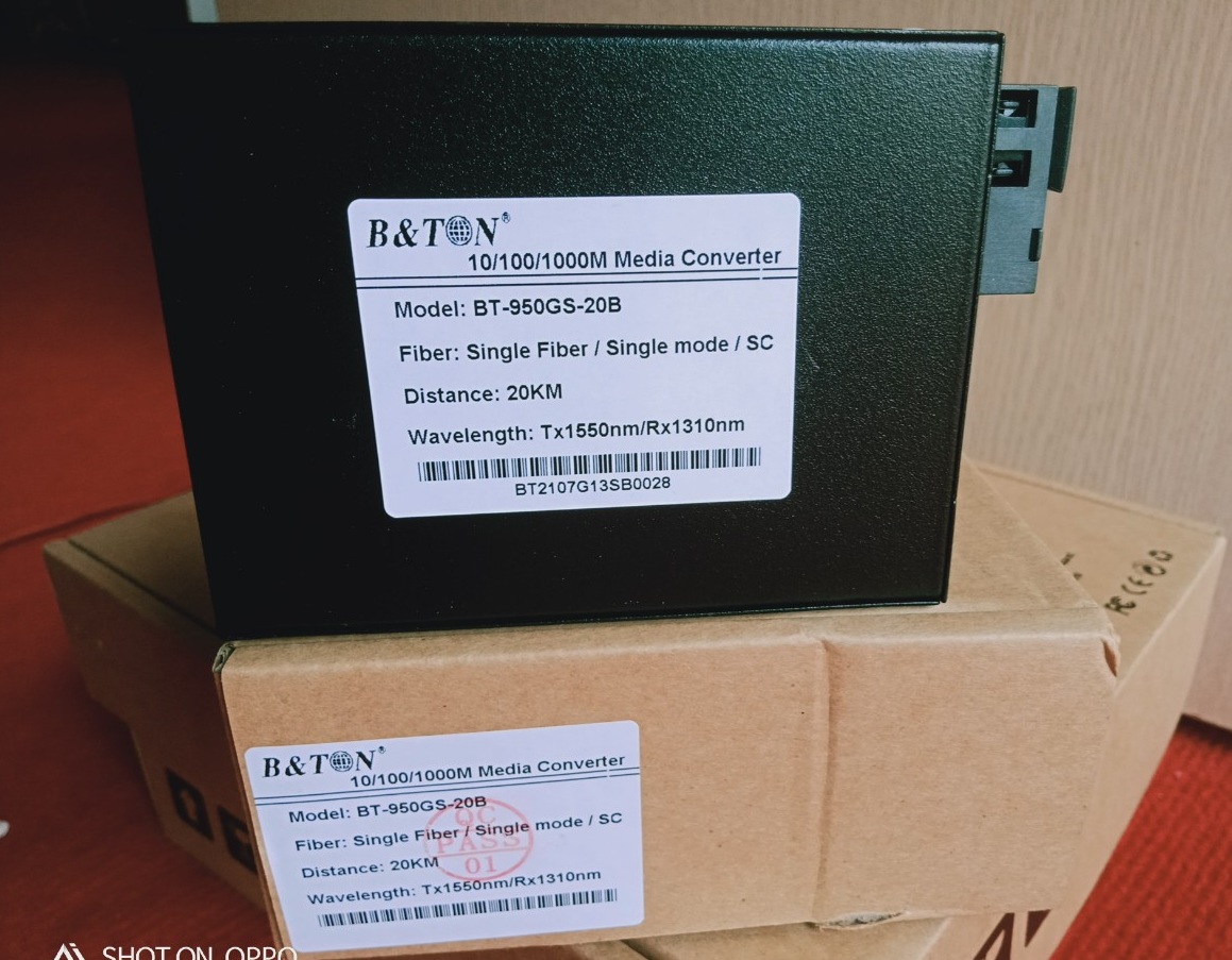 Chuyển đổi quang điện 1 sợi 10/100/1000M, hãng B&TON, Single mode - Model: BT-950GS-25B ( đầu B) - Loại1 sợi cho 10/100/1000M - Chuẩn kết nối SC, Single mdoe - Đường truyển 20km. - Bước