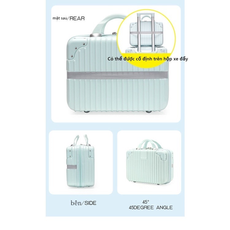 - Cốp đựng mỹ phẩm vali mini được thiết kế khoá kéo tỉ mỉ dễ dàng sử dụng, 4 góc có lớp bảo vệ cốp, bên trong khoang cốp rộng có ngăn khoá để chị em tiện sắp xếp đồ tối đa diện tích sử dụng.