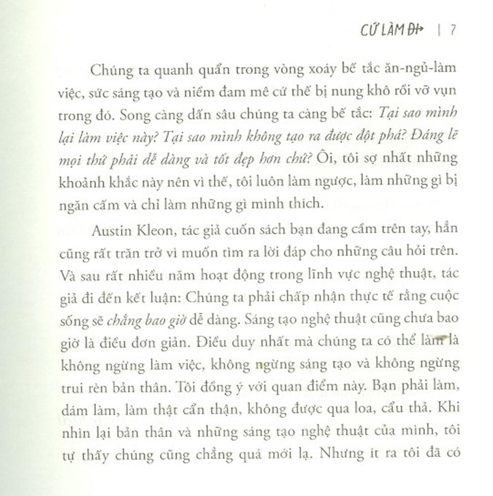Cho dù bạn đang kiệt sức, ở giai đoạn khởi động phải làm lại từ đầu, hay là đang vô cùng thành công đi chăng nữa, Cứ Làm Đi! sẽ giúp bạn tiếp bước trên con đường sáng tạo nghệ thuật.