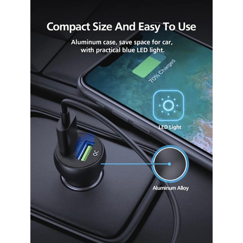 Bộ sạc ô tô ACEFAST B6, tổng công suất 63W, vật liệu thân bằng hợp kim nhôm với màn hình led hiển thị. Thông số kỹ thuật: - Input: DC12-24V. - Output: USB-A: 18W (tương thích với QC3.0 /