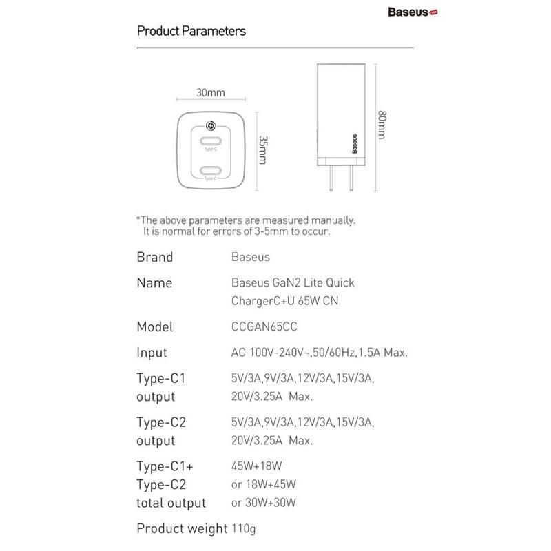 Thương hiệu: Baseus Tên: Bộ sạc nhanh máy tính để bàn Baseus GaN3 Pro Mẫu số: CCDK65S Đầu vào: AC 100-240V ~, 50 / 60Hz, 1.5A Max. Đầu ra: Đầu ra Type-C1 / Type-C2: 5V