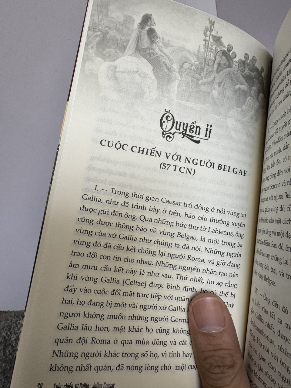 Ông hầu như không để lại tác phẩm nào, chỉ có duy nhất Commentarii de Bello Gallico (thường được dịch sang tiếng Anh là Gallic Wars) và một cuốn rất mỏng khác về thời kỳ nội chiến giữa ông với Pompei diễn ra ngay sau các chiến dịch của ông tại Gallia. Xứ Gallia (hay xứ Gaul) là vùng đất luôn có xung đột vũ trang với La Mã và người La Mã rất dè chừng những bộ tộc đông đảo và thiện chiến ở phương Bắc này. Thế nhưng Julius Caesar đã lựa chọn Gallia để khởi đầu sự nghiệp quân sự của ông sau khi được Pompei hậu thuẫn. Cuốn sách mà Book Hunter chọn dịch này chính là ghi chép lại (có thể của ông hoặc của các tướng sĩ bên cạnh ông) trong suốt các trận đánh với những bộ tộc được gọi là người Celt này. Tác phẩm là một tài liệu quan trọng và hiếm hoi vì chứa đựng những tài liệu tham khảo trực tiếp về văn hóa, lối sống của người Celt, về bối cảnh chính trị cũng như chiến thuật quân sự của La Mã lúc bấy giờ, đặc biệt là dấu ấn của Julius Caesar trong vai trò là nhà chiến lược và nhà ngoại giao tài năng.