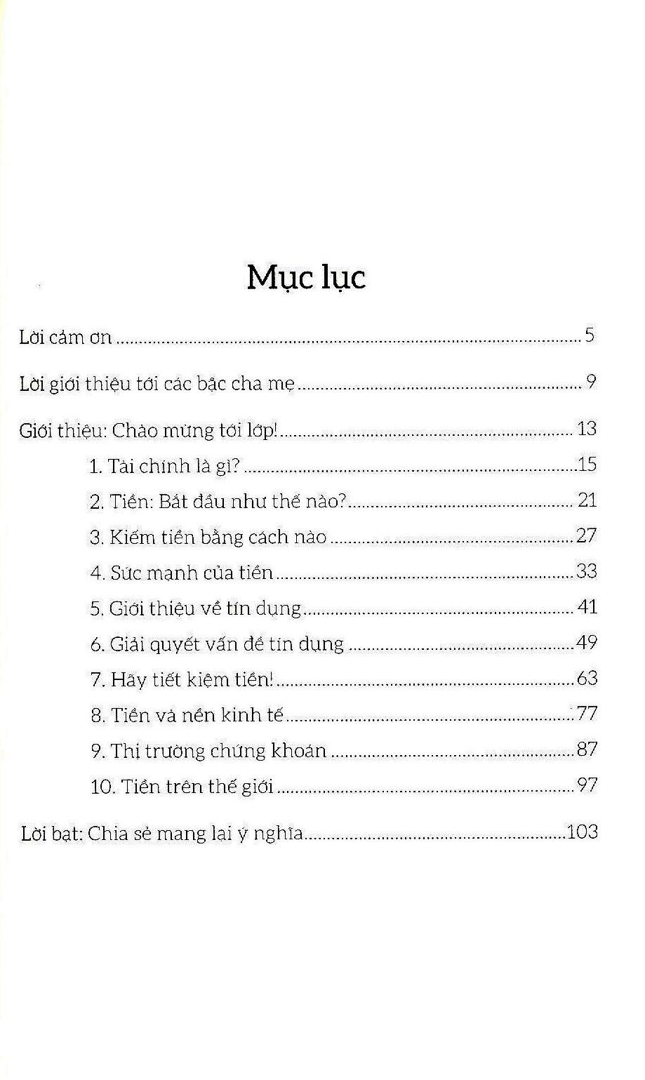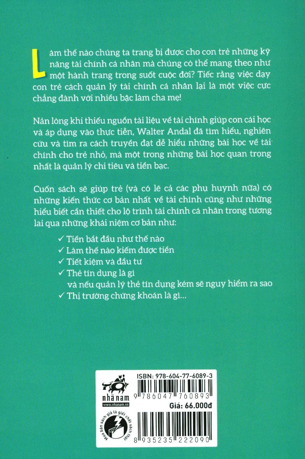 Cuốn sách sẽ giúp trẻ (và có lẽ cả các phụ huynh nữa) có những kiến thức cơ bản nhất về tài chính cũng như những hiểu biết cần thiết cho lộ trình tài chính cá nhân trong tương lai qua những khái niệm cơ bản như: