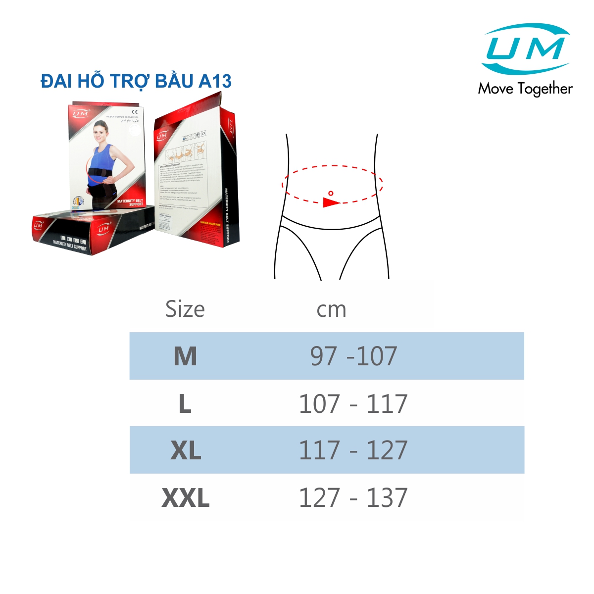 Đai hỗ trợ bầu UM (A13) là đai lưng có thiết kế đặc biệt hỗ trợ phần lưng thấp ở khung chậu và đau phần Sacro-Iliac ở phụ nữ mang thai. Đai hỗ trợ bầu UM có tác dụng nâng đỡ phần bụng và em bé trong bụng, giảm bớt gánh nặng trên thắt lưng cho người mẹ khi mang thai. CHỈ ĐỊNH