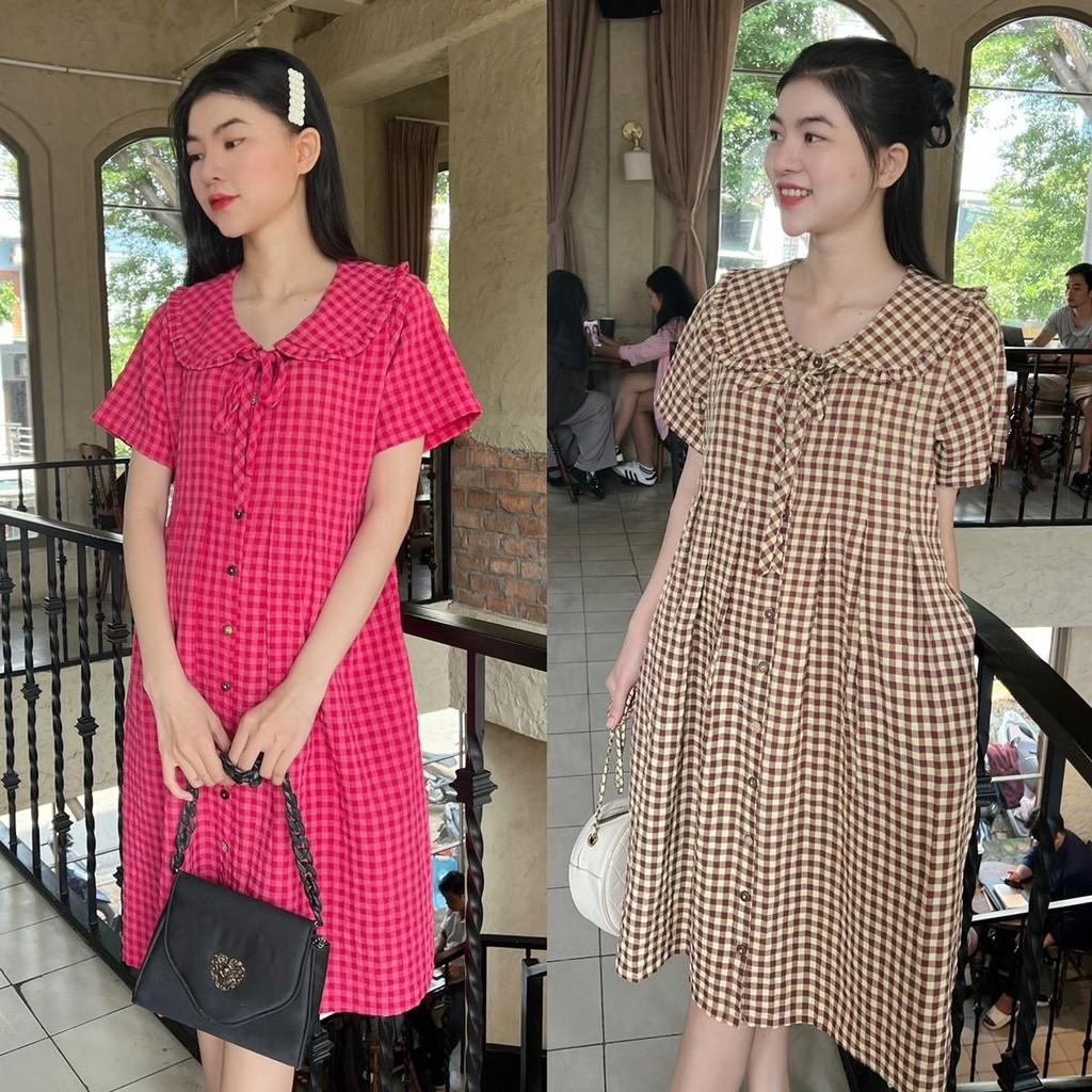 ✨Đầm bầu karo cổ bèo thắt nơ dáng suông dễ thương, trẻ trung, năng động Nữ Women