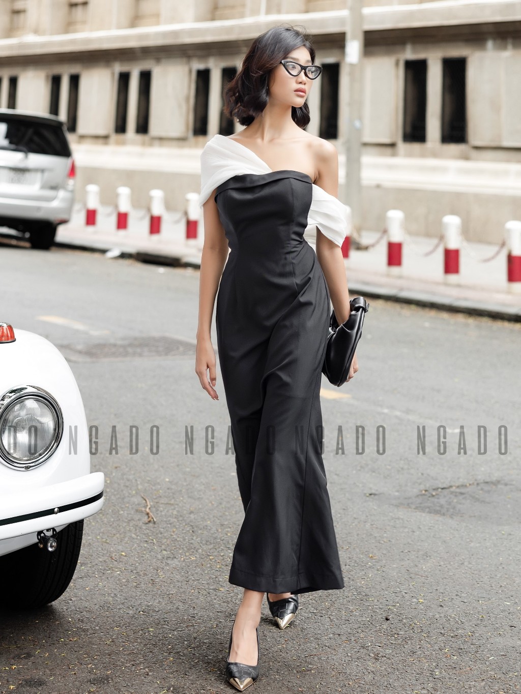 ✨Đầm đuôi cá đen phối trắng NGADO , đầm nữ , Đầm dự tiệc sang chảnh , Đầm đuôi cá hở vai