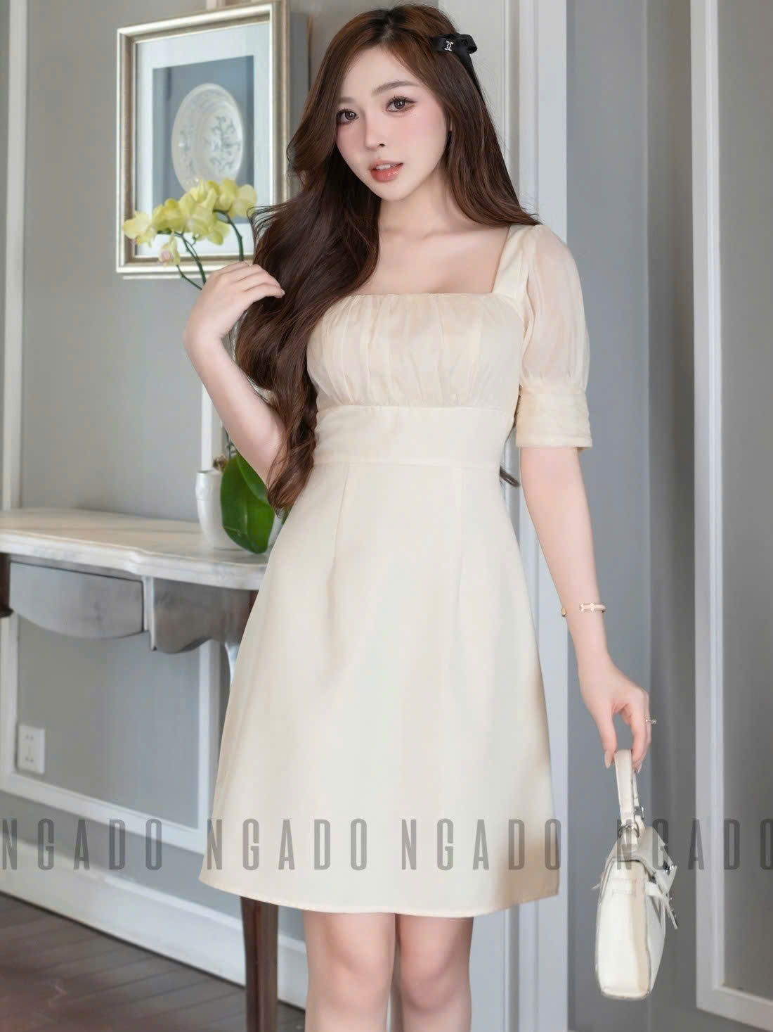 ✨Đầm kem cổ vuông phối voan NGADO , đầm kiểu Nữ , đầm voan