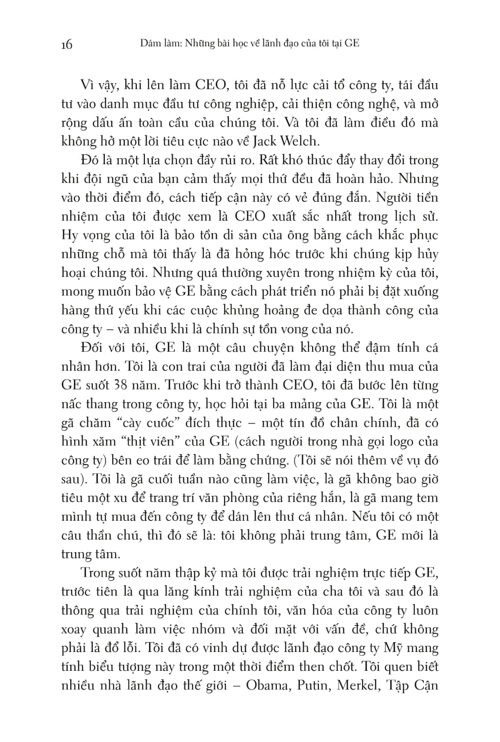 "Dám làm: Những bài học về lãnh đạo của tôi tại GE" ghi lại những kinh nghiệm và bài học của Jeff Immelt, cựu CEO của General Electric (GE), từ thời gian lãnh đạo tập đoàn này. Cuốn sách đưa người đọc vào cuộc hành trình của Immelt từ khi tiếp quản vị trí CEO vào năm 2001, kế nhiệm Jack Welch - một trong những CEO nổi tiếng và thành công nhất trong lịch sử kinh doanh Mỹ, cho đến khi ông rời GE vào năm 2017.