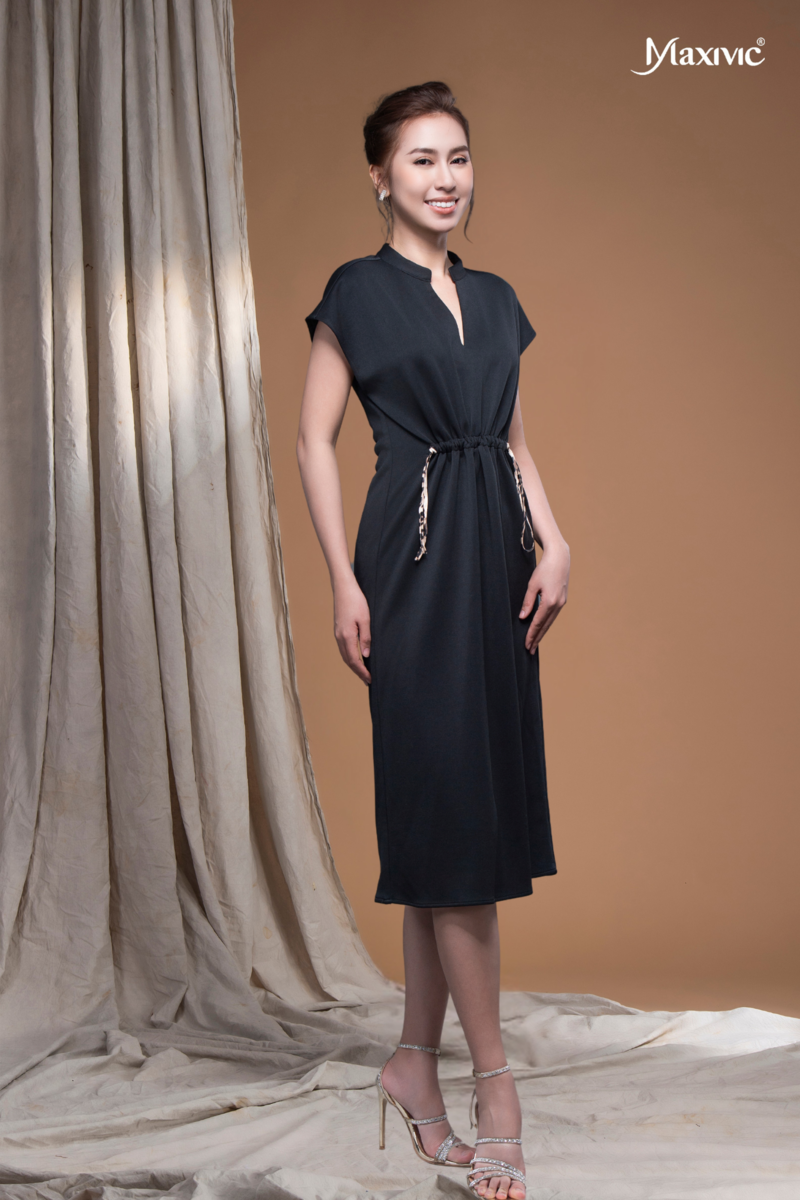 ✨Đầm thun đen cổ sơmi tim, rút dây Maxivic LM062405 [BST Da Beo]
