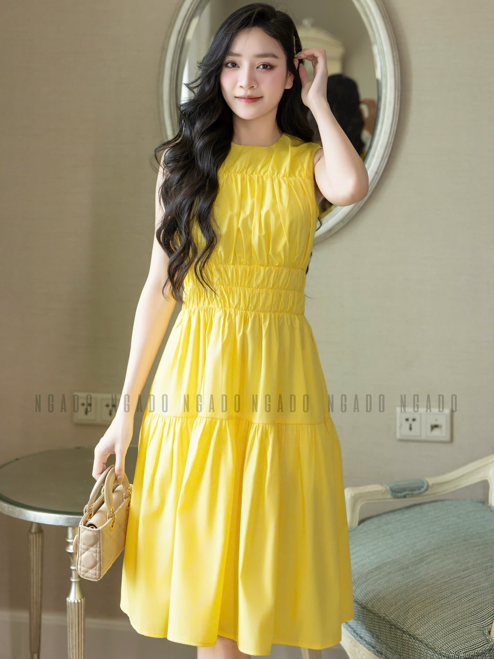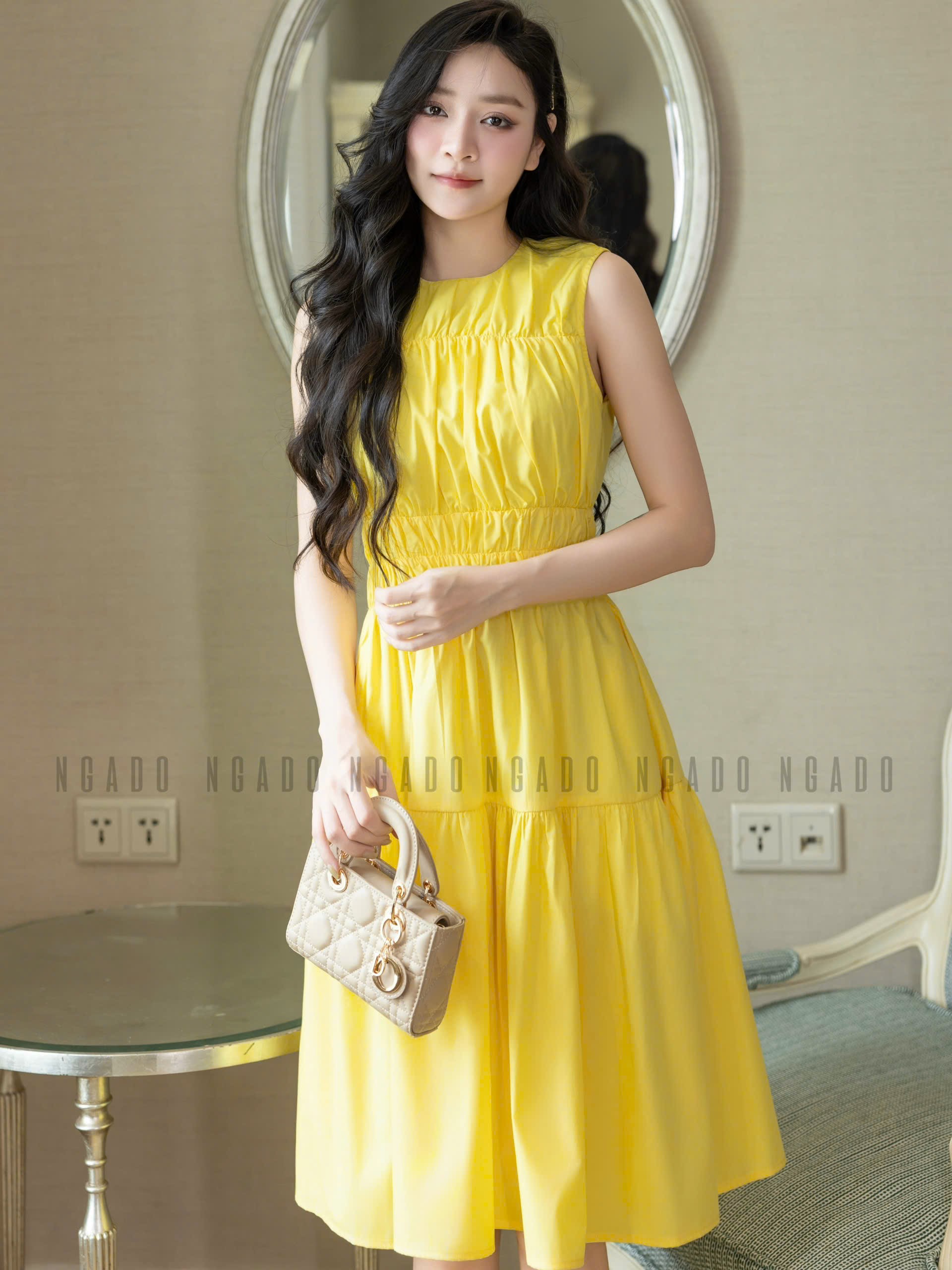 ✨Đầm vàng nhún eo NGADO , đầm dài , đầm sát nách , đầm kiểu Nữ