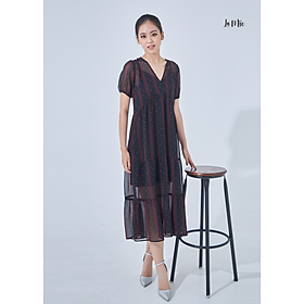Mua tại TiktokĐầm voan họa tiết mini sọc đỏ cổ chữ V, tay ngắn viền chun phồng nhẹ, chân váy nhún bèo 3 tầng. Đầm lót 2 dây: màu đen, cổ chữ V, phần váy ngắn trên gối.