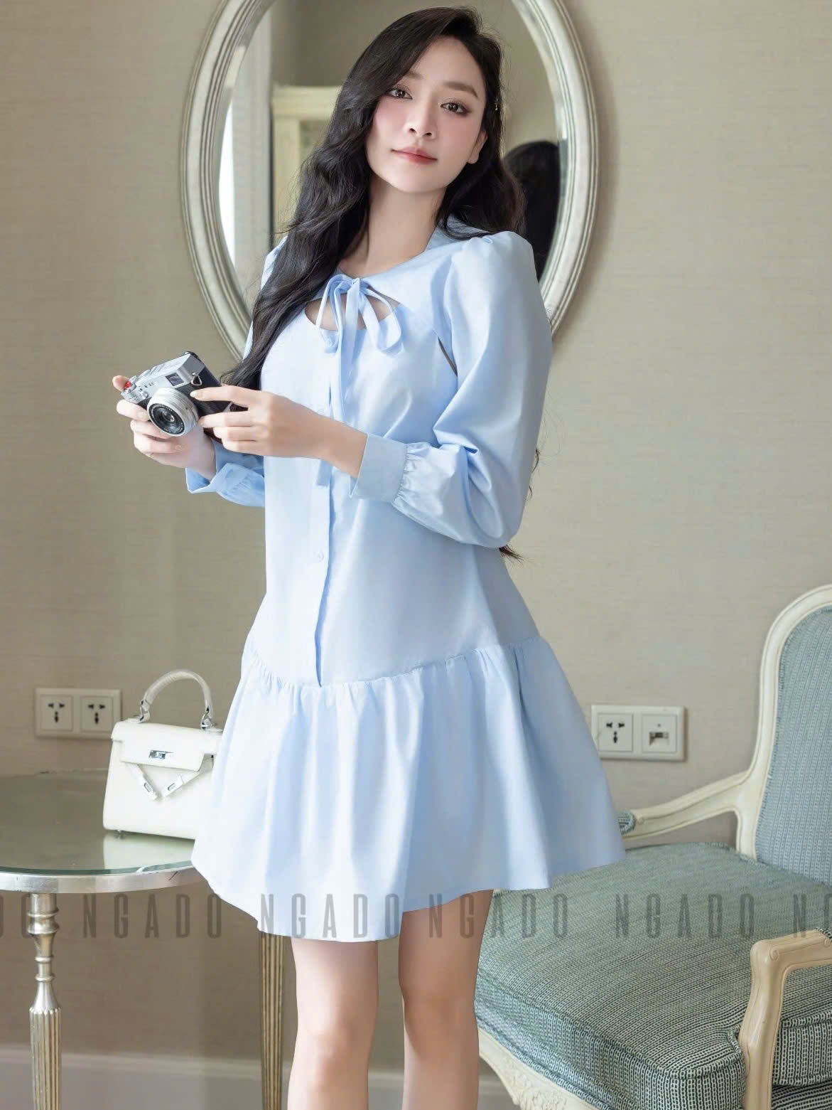 ✨Đầm xanh tay dài phối nơ NGADO , đầm dự tiệc , công sở