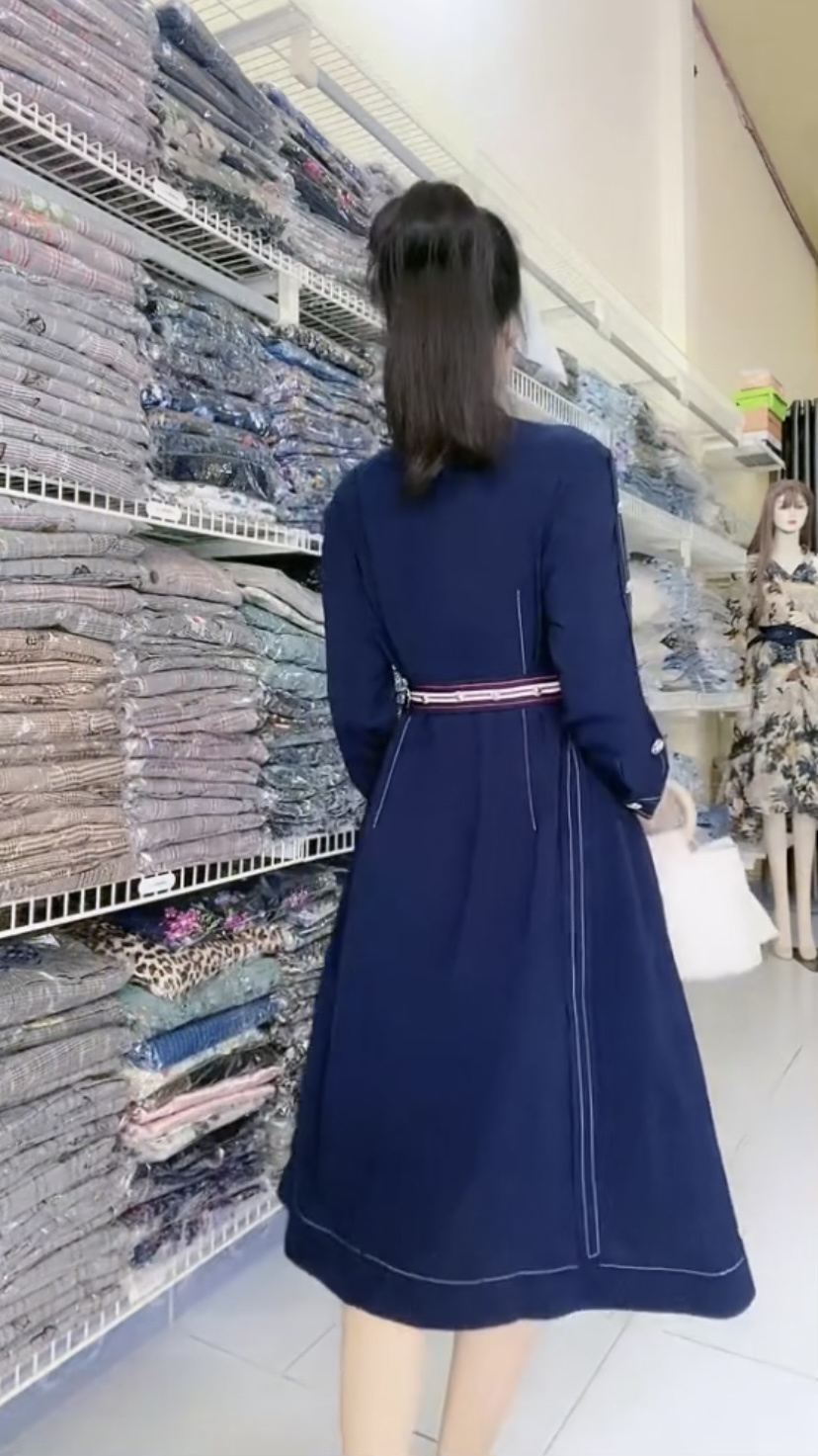 - kiểu dáng đầm suông nhấn eo thoải mái bằng dây thắt lưng rời - tay liền, điểm ngọc trai xám - cổ lá sen rộng, nhấn cùng hàng nút cài trước - tà