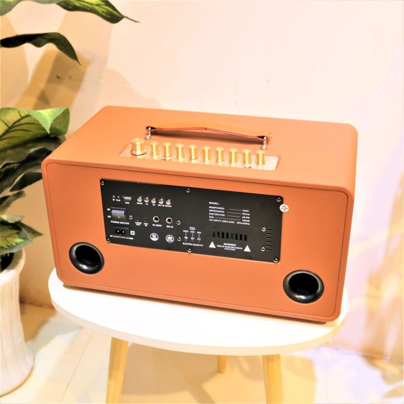 _Nguồn DC 12V bat in _ Bass 2T x 2, Treble x 10 _ Sử dụng bo CLASS D _Hỗ trợ USB, HDMI, Bluetooth, guitar in, mic in _Phụ kiện 2 mic cầm tay không