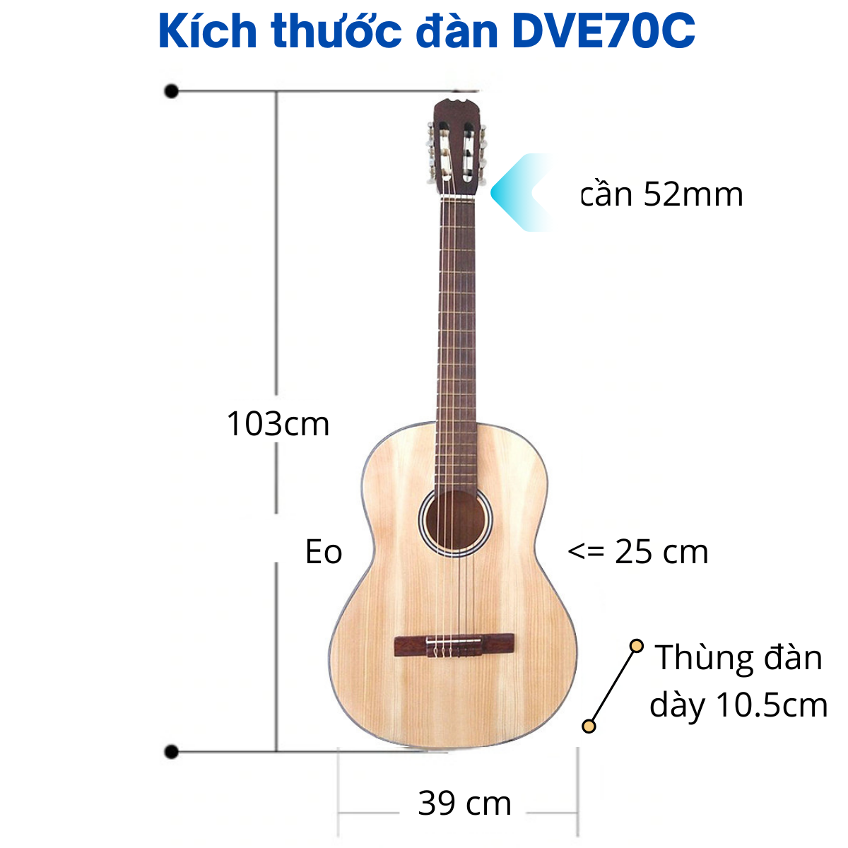 Thông tin chi tiết cây đàn cổ điển DVE70CX có EQ Đàn Guitar Classic DVE70CX Mã: DVE70CX Mặt: gỗ thông Eo + lưng: ván ép chất lượng cao Cần: gỗ thao lao Mặt phím: gõ