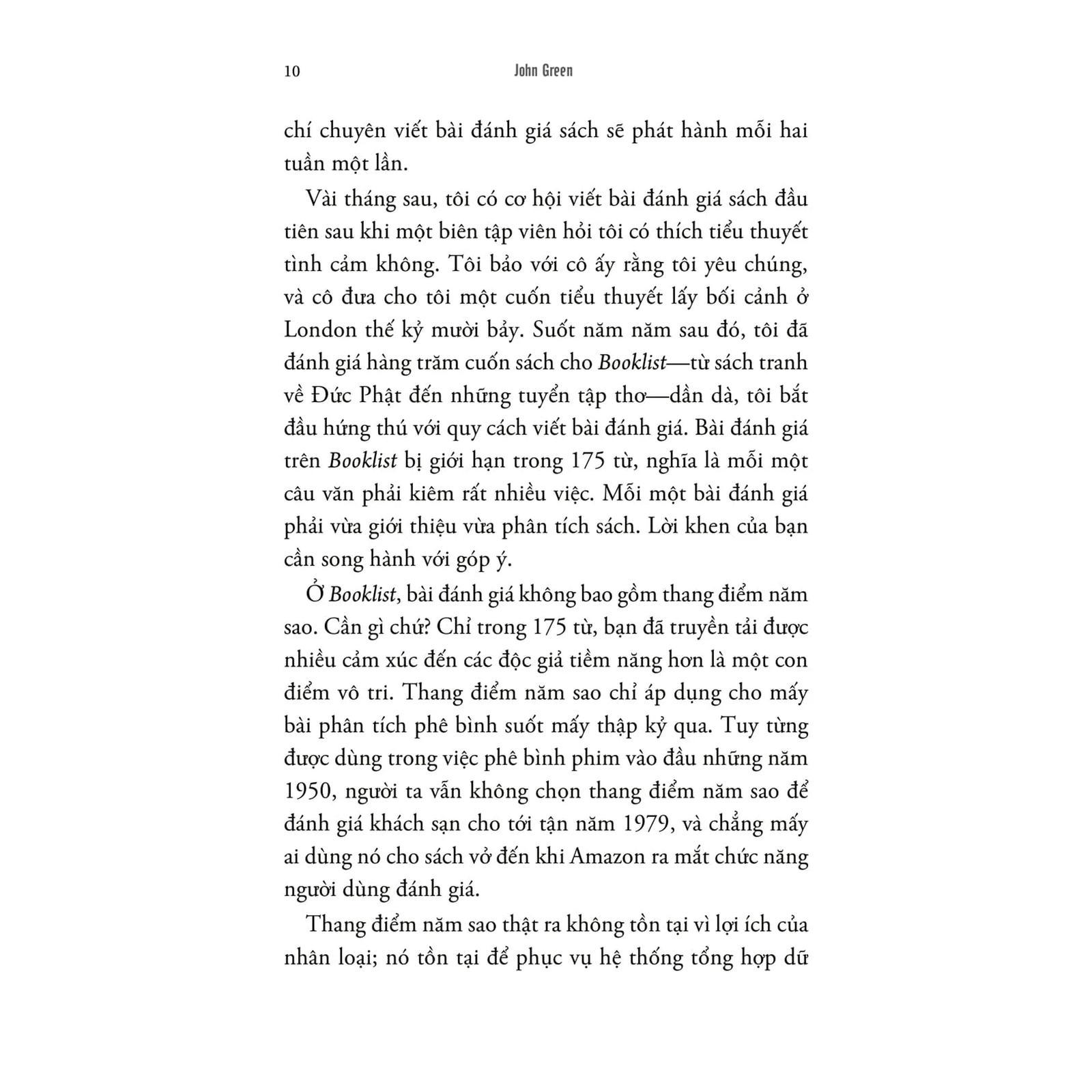 Các bài viết trong "Đánh giá kỷ nhân sinh" một lần nữa cho thấy tài kể chuyện hiếm có của John Green. Tác phẩm là cuộc hành trình khám phá đầy cảm hứng về những con đường mà chúng ta đã khai mở, đồng thời là một lời tụng ca chân thành về tình yêu dành cho thế giới.