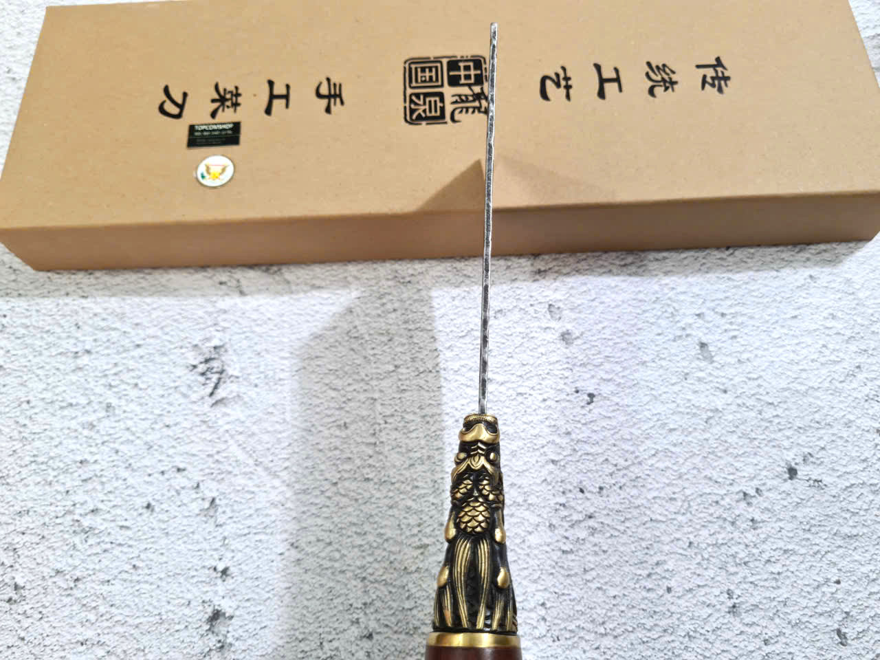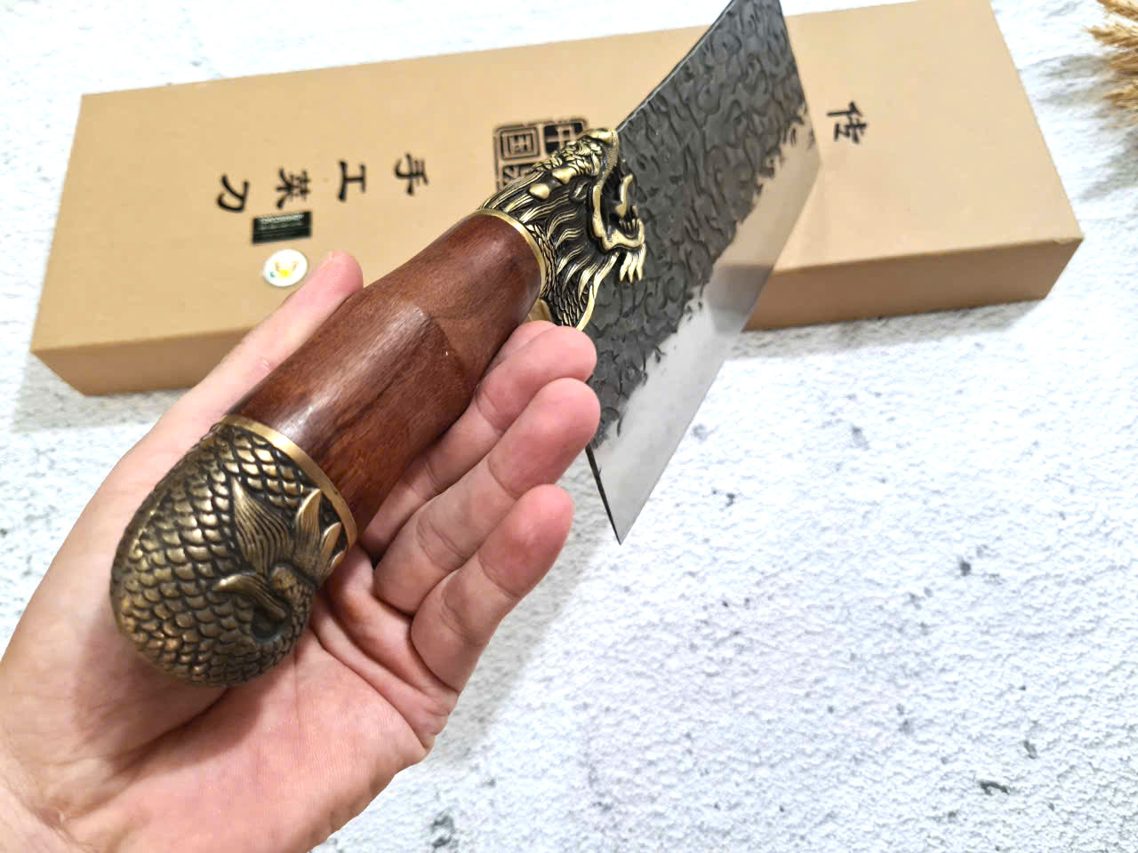 Chất liệu tay cầm: gỗ CẨM LAI, khâu và chuôi cuối dao bằng đồng thau